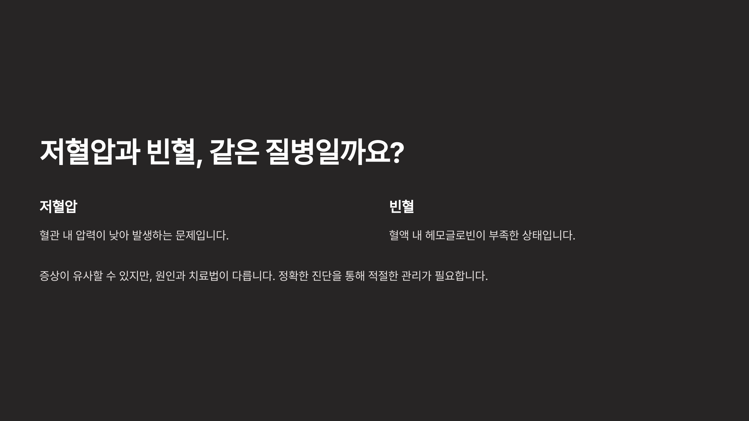 저혈압과 빈혈은 혼동하기 쉬운 건강 문제예요. 두 가지 모두 어지러움과 피로감을 유발하기 때문에 같은 증상으로 오해하기 쉬운데요. 하지만 원인은 전혀 다르답니다.