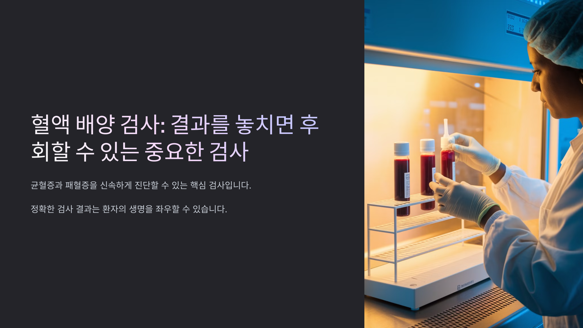 혈액 배양 검사는 혈류 감염을 조기에 발견하고, 감염된 균에 맞는 항생제를 선택하는 데 중요한 역할을 해요. 정확한 진단을 위해서는 올바른 절차가 필수예요! 👨⚕️