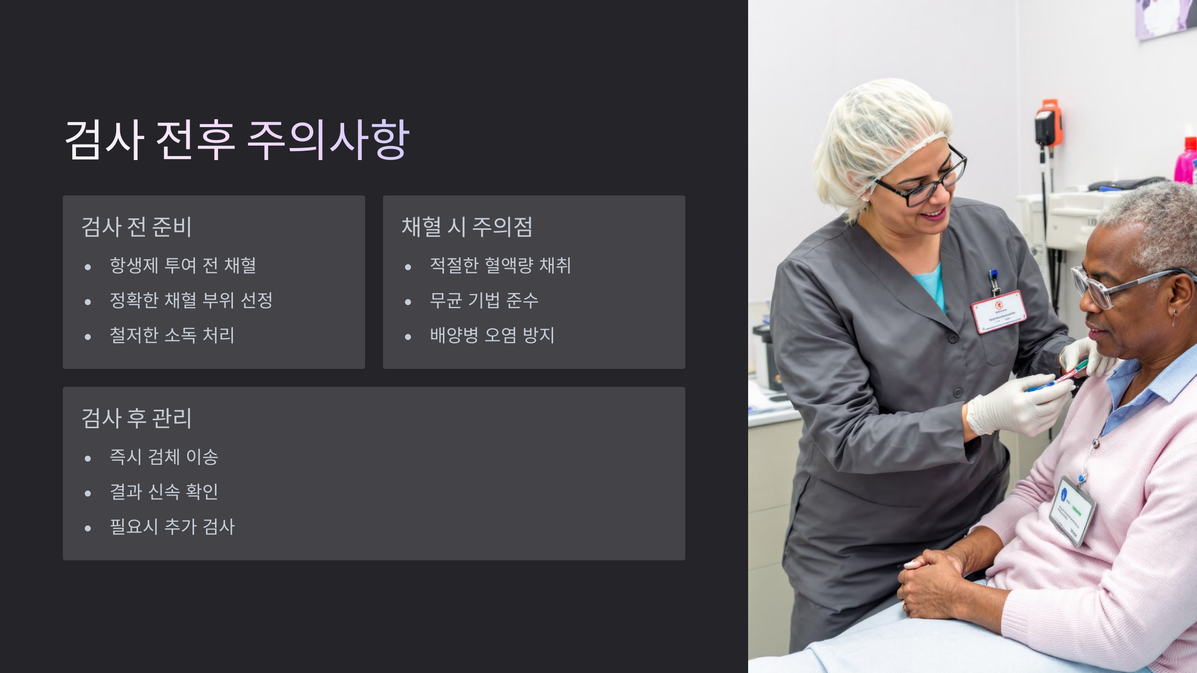 혈액 배양 검사는 단순한 피검사가 아니에요. 정확한 결과를 얻기 위해 신중하게 진행되어야 하는 과정이죠. 💉