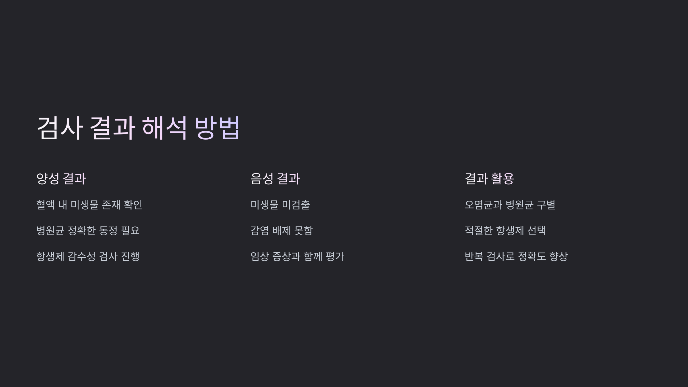 음성 (Negative) | 혈액에서 균이 검출되지 않음 | 추가 검사가 필요할 수도 있음 |