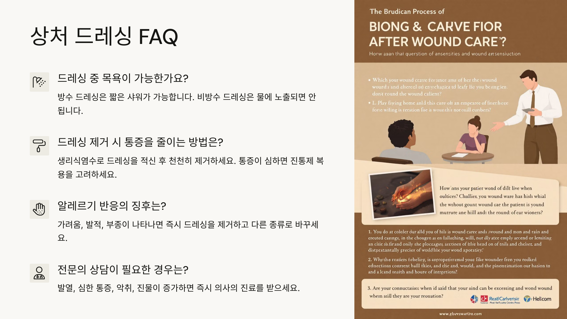 드레싱 교체도 중요한 과정이니까 신중하게 해야 해요! 😊 이제 '상처 드레싱 관련 자주 묻는 질문(FAQ)'을 확인해볼까요?