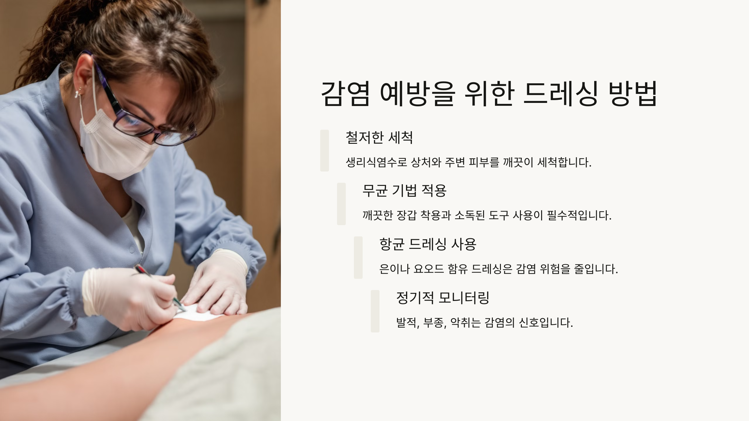 상처에 맞는 드레싱을 잘 선택하는 것이 빠른 회복의 지름길이에요! 😊 이제 '감염 예방을 위한 드레싱 방법'을 알아볼까요?
