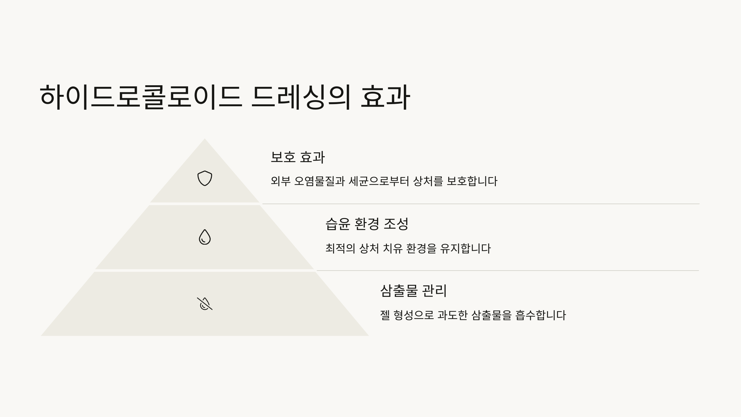 | 깊은 상처 | 하이드로콜로이드 | 습윤 환경 유지, 흉터 최소화 |
