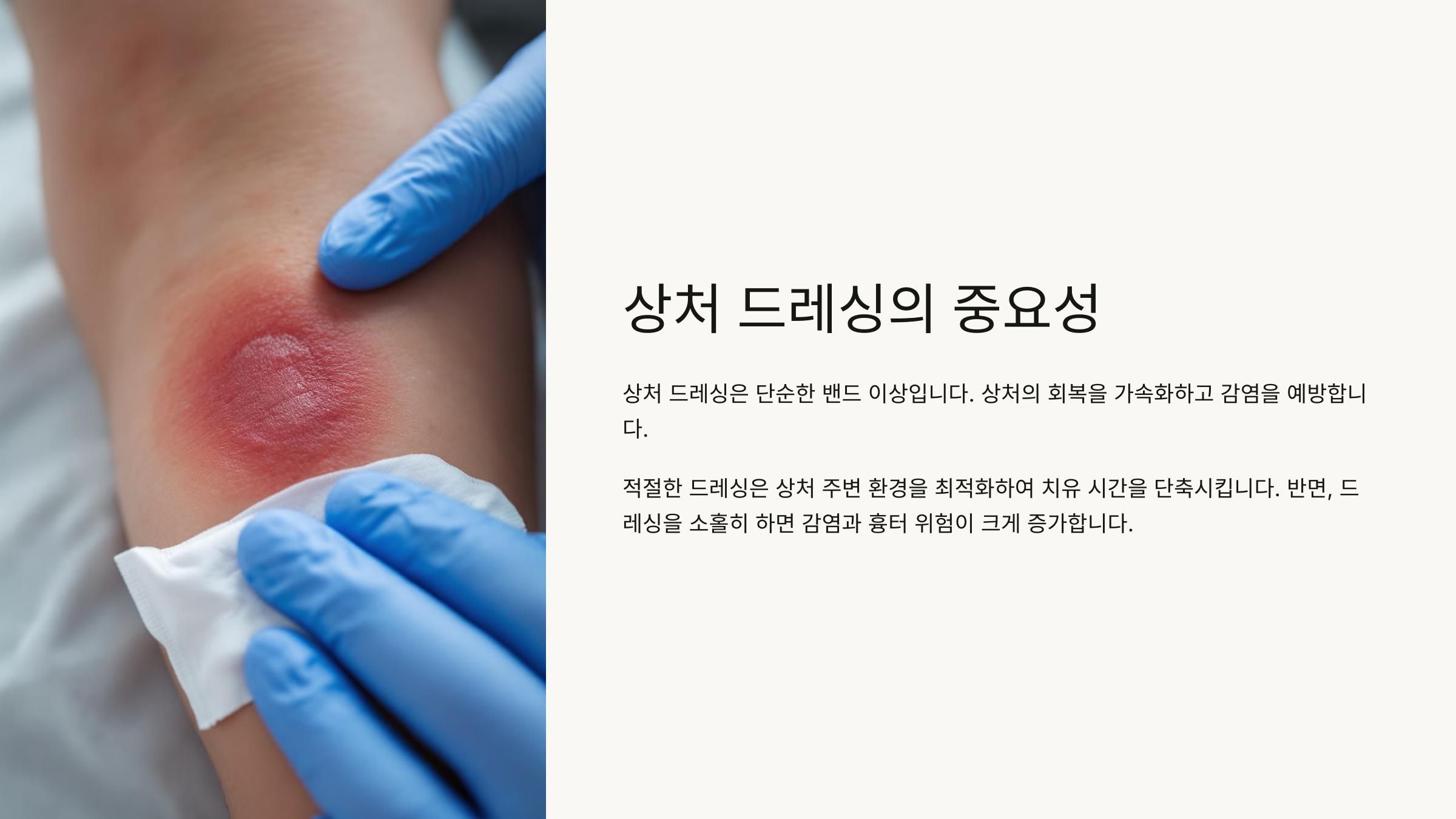 상처가 생겼을 때 그냥 두면 빠르게 아물 것 같지만, 오히려 감염 위험이 커질 수 있어요. 🦠 상처 부위가 공기 중에 노출되면 먼지와 세균이 달라붙어 염증이 발생할 가능성이 높아지죠. 이런 이유로 상처를 적절히 보호하는 '드레싱'이 필수적이에요.