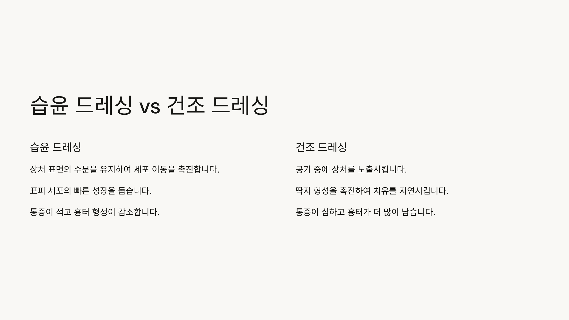 | 상처 보호 | 상처를 덮어 습도 유지 | 공기에 노출 |