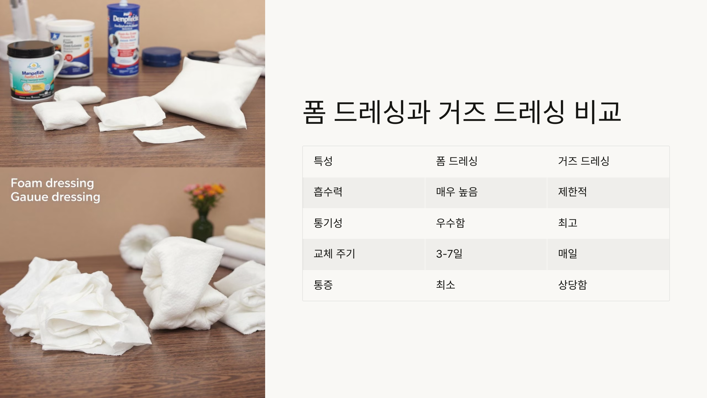이제 '폼 드레싱과 거즈 드레싱 비교' 섹션으로 넘어갈게요! 😊