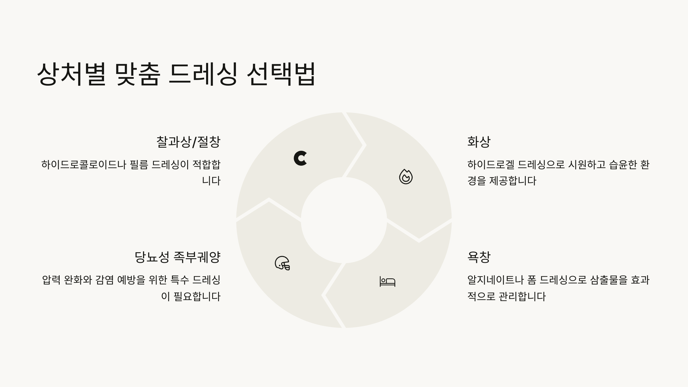 이제 '상처별 맞춤 드레싱 선택법'에 대해 알아볼까요? 😊