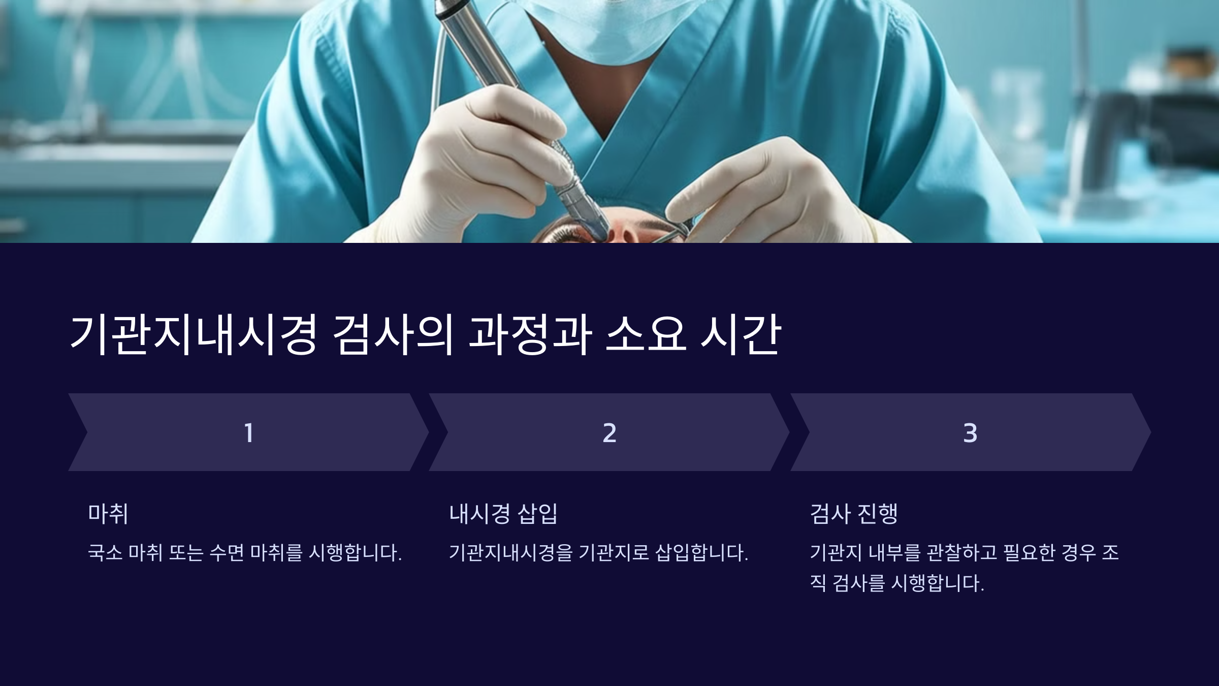 | 내시경 삽입 | 기관지 내부 관찰 및 조직 채취 | 10~30분 |