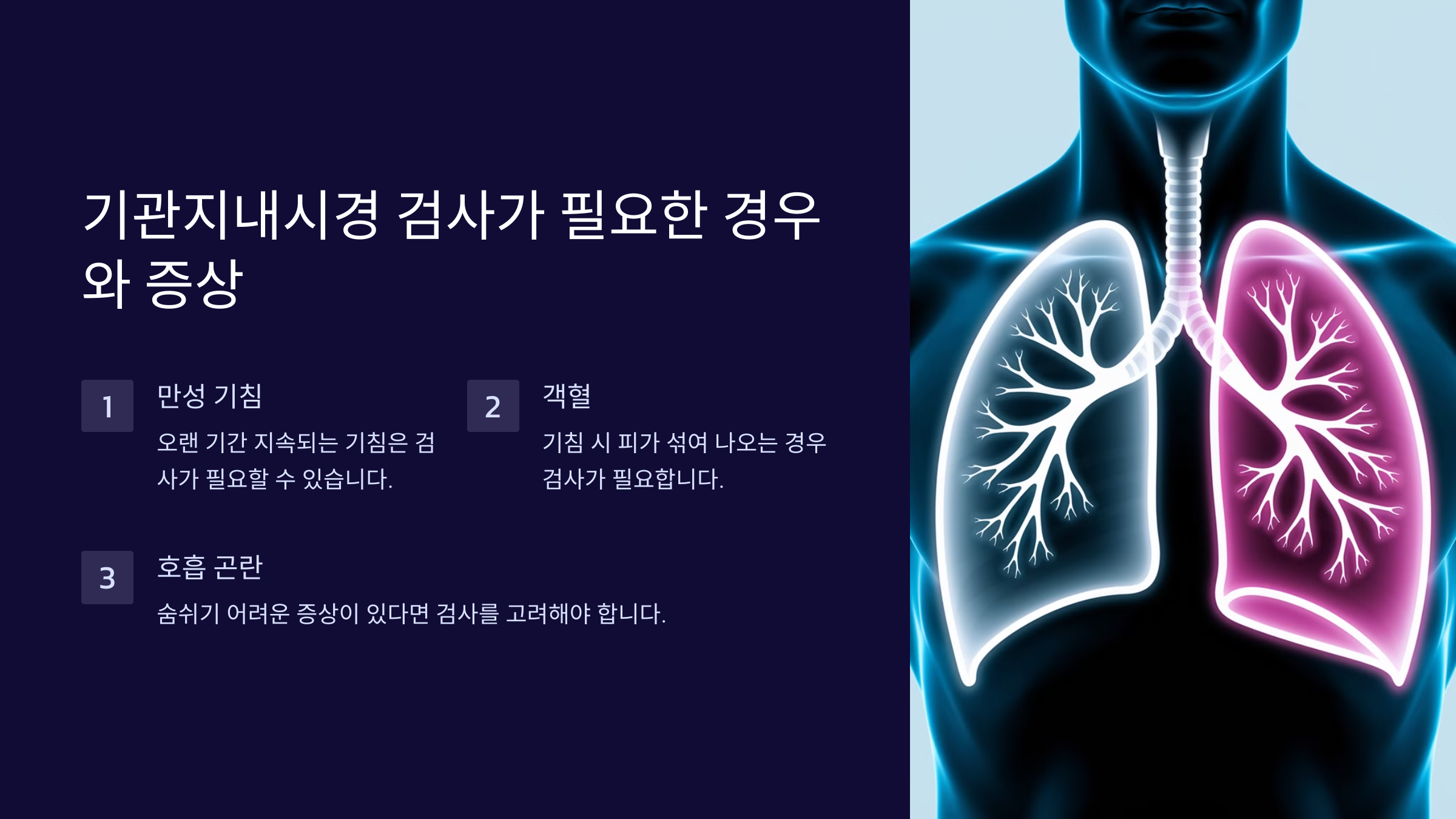 위의 증상들이 있다면 기관지내시경 검사를 고려해봐야 해요. 특히, 폐암이 의심되거나 만성 폐질환이 있는 경우 조기 진단이 중요하기 때문에 검사를 미루지 않는 것이 좋아요. 🩺