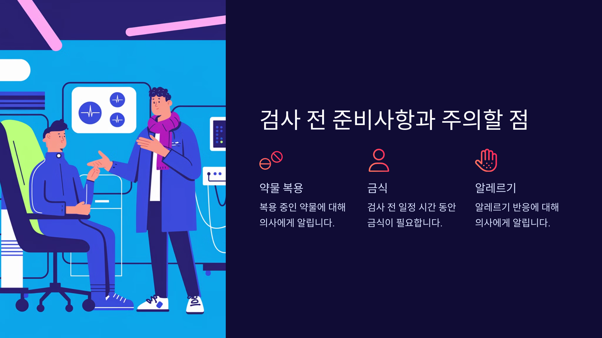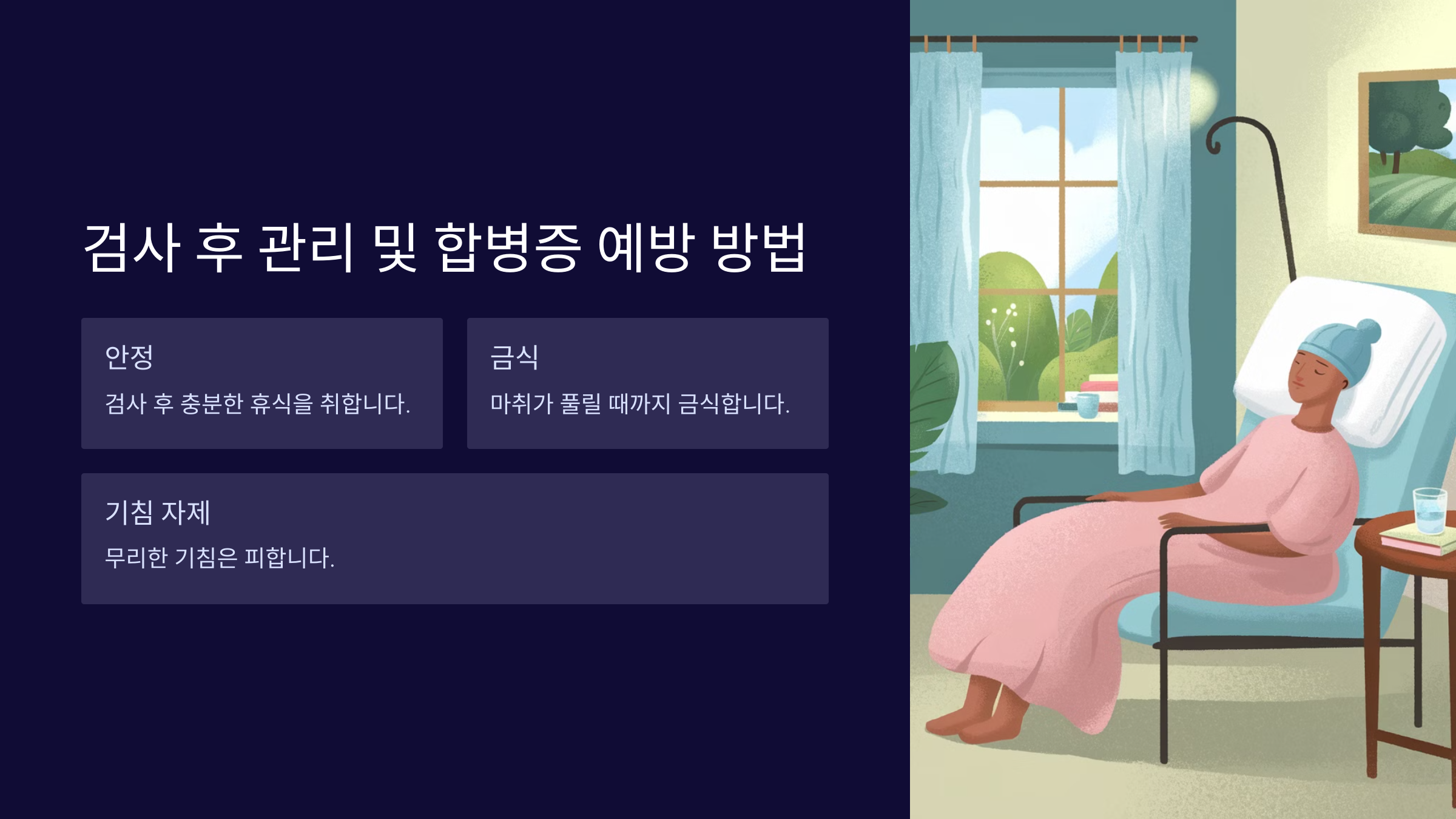 검사가 끝났다고 해서 끝이 아니죠! 검사 후 주의사항과 합병증 예방 방법을 이어서 알아볼까요? 🏥
