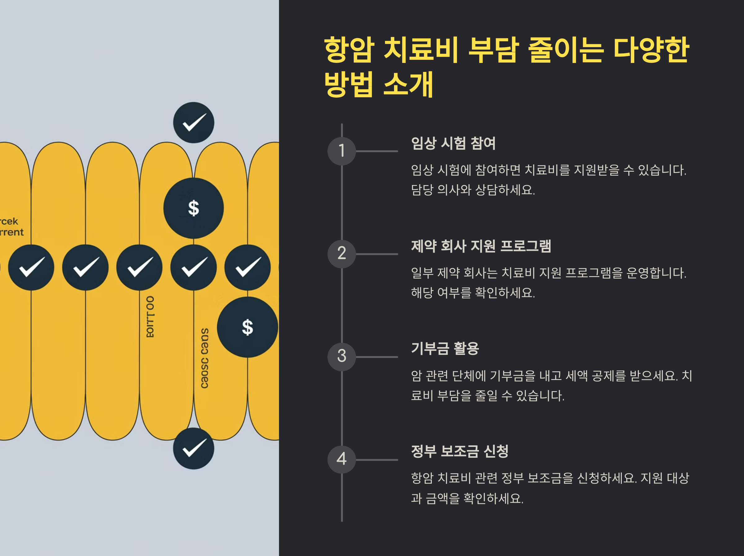 그럼 구체적으로 어떻게 하면 항암 치료비 부담을 줄일 수 있을까요? 👇