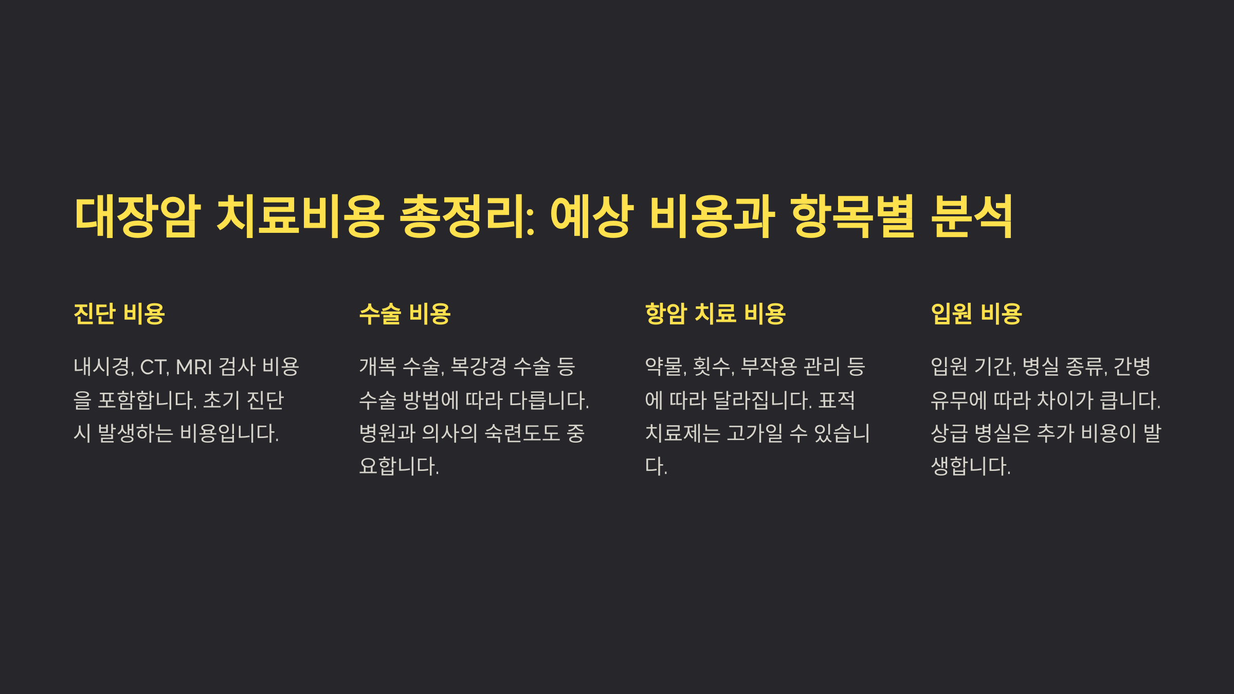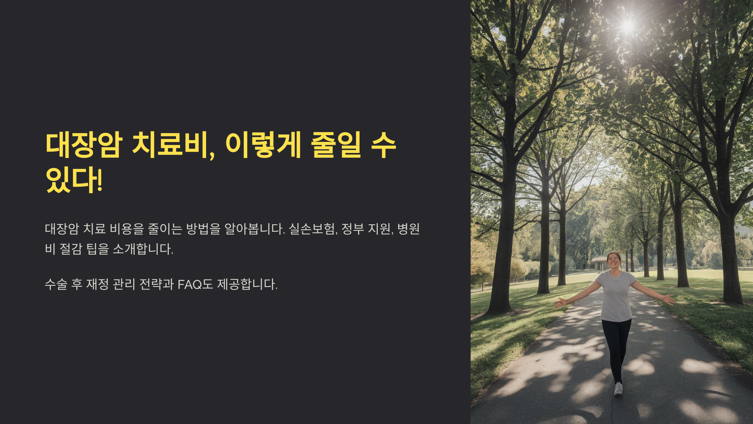 위 정보를 활용하면 대장암 치료비 부담을 줄이고, 효과적으로 재정 관리를 할 수 있을 거예요! 💪