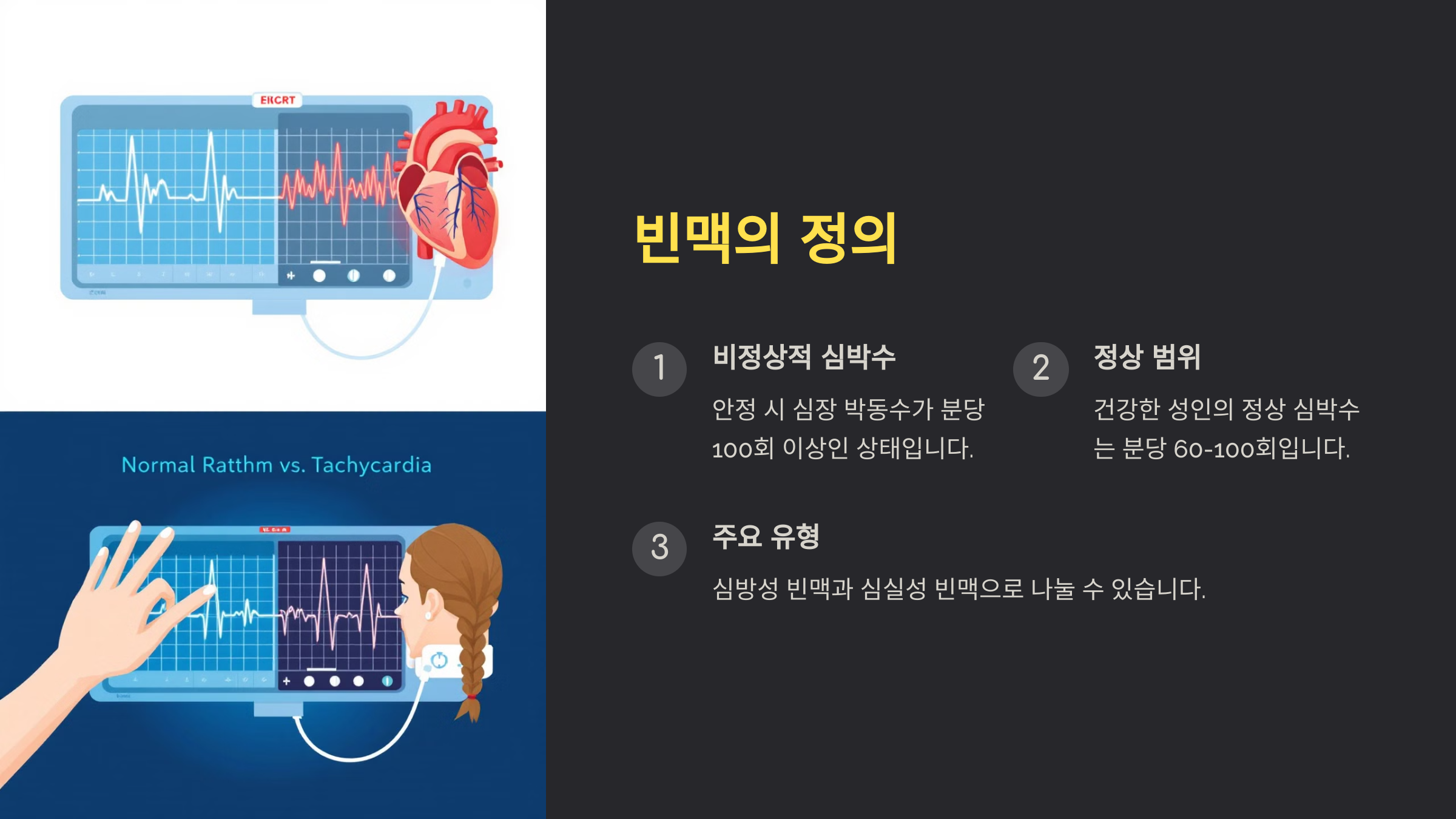 빈맥(Tachycardia)이란 심장이 정상보다 빠르게 뛰는 상태를 말해요. 일반적으로 성인의 정상적인 심박수는 1분에 60~100회 정도인데, 빈맥이 발생하면 100회를 넘는 경우가 많아요. 이는 심장의 부담을 증가시켜 다양한 건강 문제를 유발할 수 있어요.