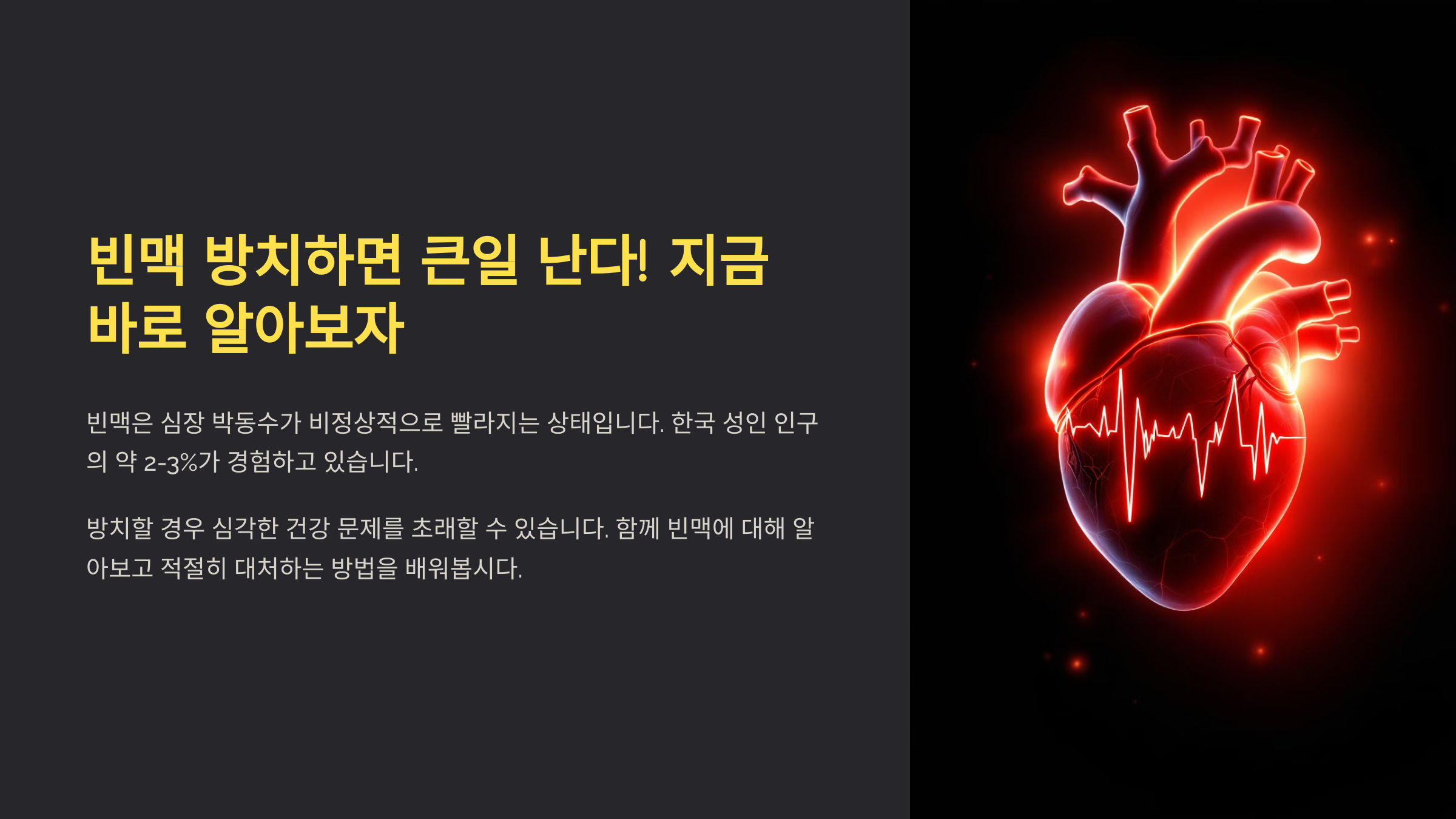 가슴이 두근거리고 불규칙한 심장 박동을 느낀 적 있나요? 이는 ‘빈맥’일 가능성이 있어요. 빈맥은 심장이 정상보다 빠르게 뛰는 상태를 말하는데, 단순한 긴장이나 스트레스 때문일 수도 있지만 심각한 건강 문제의 신호일 수도 있어요.