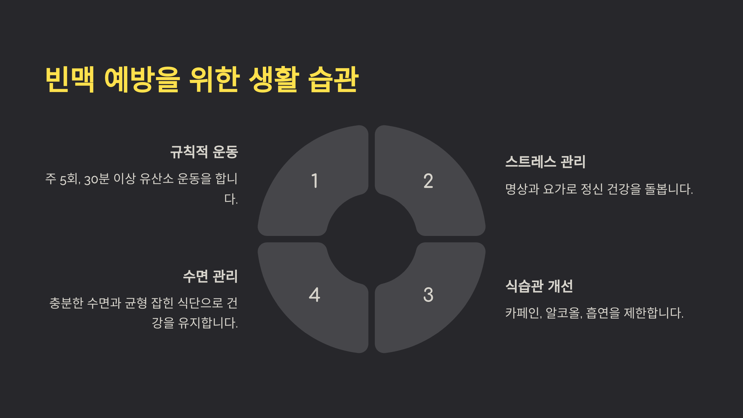 빈맥을 예방하려면 꾸준한 건강 관리가 필수예요. 심장이 정상적으로 작동하도록 돕는 생활 습관을 실천하면 빈맥의 위험을 줄일 수 있어요.