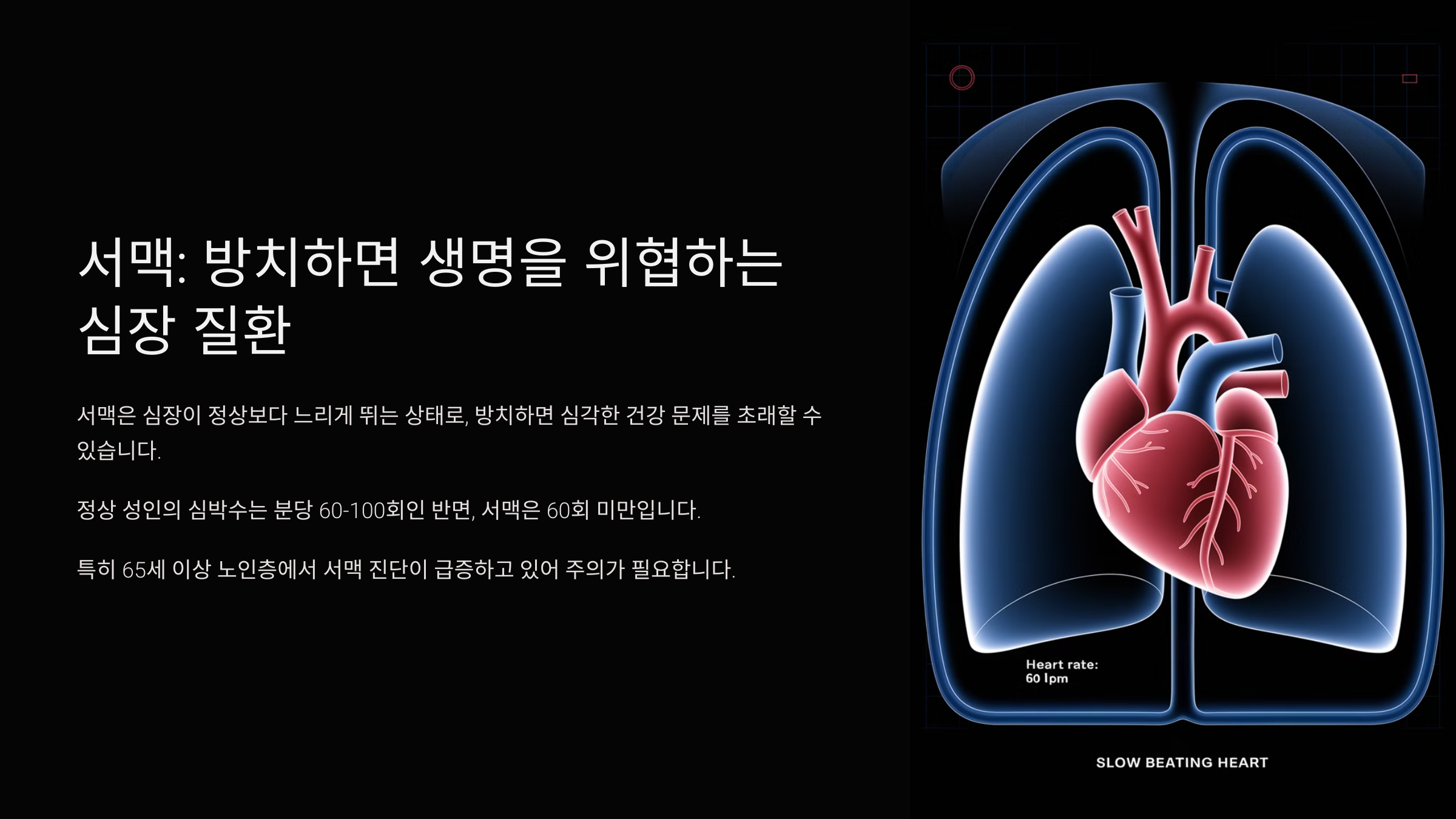 우리의 심장은 하루도 쉬지 않고 뛰고 있어요. 그런데 정상보다 느리게 뛰는 '서맥'이 발생하면 몸에 다양한 이상 신호가 나타날 수 있어요. 초기에는 가벼운 어지럼증이나 피로감으로 시작될 수 있지만, 심하면 실신이나 심정지로 이어질 위험도 있어요.