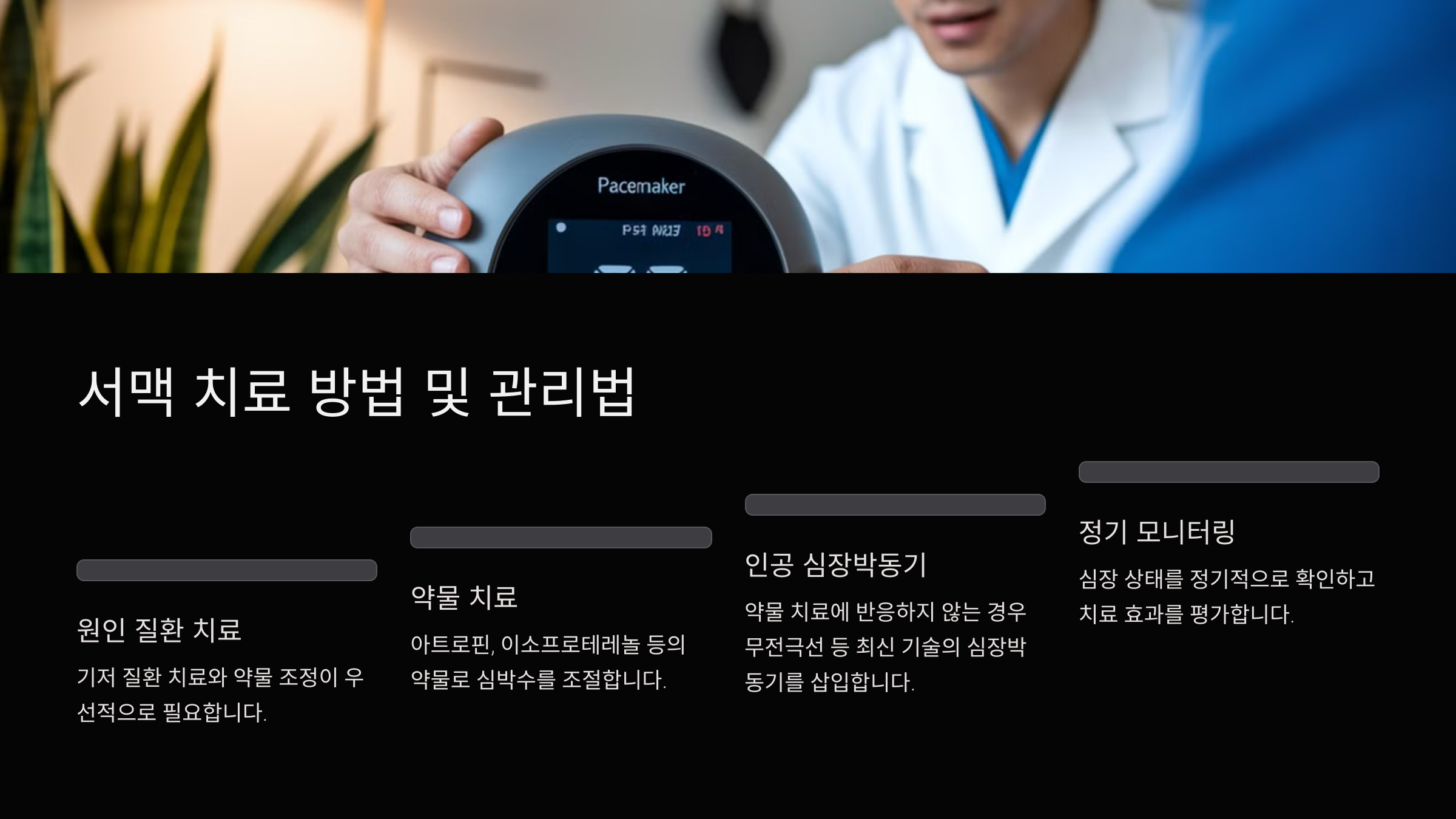 심박수가 너무 낮아 실신이나 호흡 곤란 같은 증상이 나타난다면, 인공 심박동기 삽입이 필요할 수 있어요. 이 장치는 전기 신호를 보내 심장이 정상적으로 뛰도록 도와줘요.