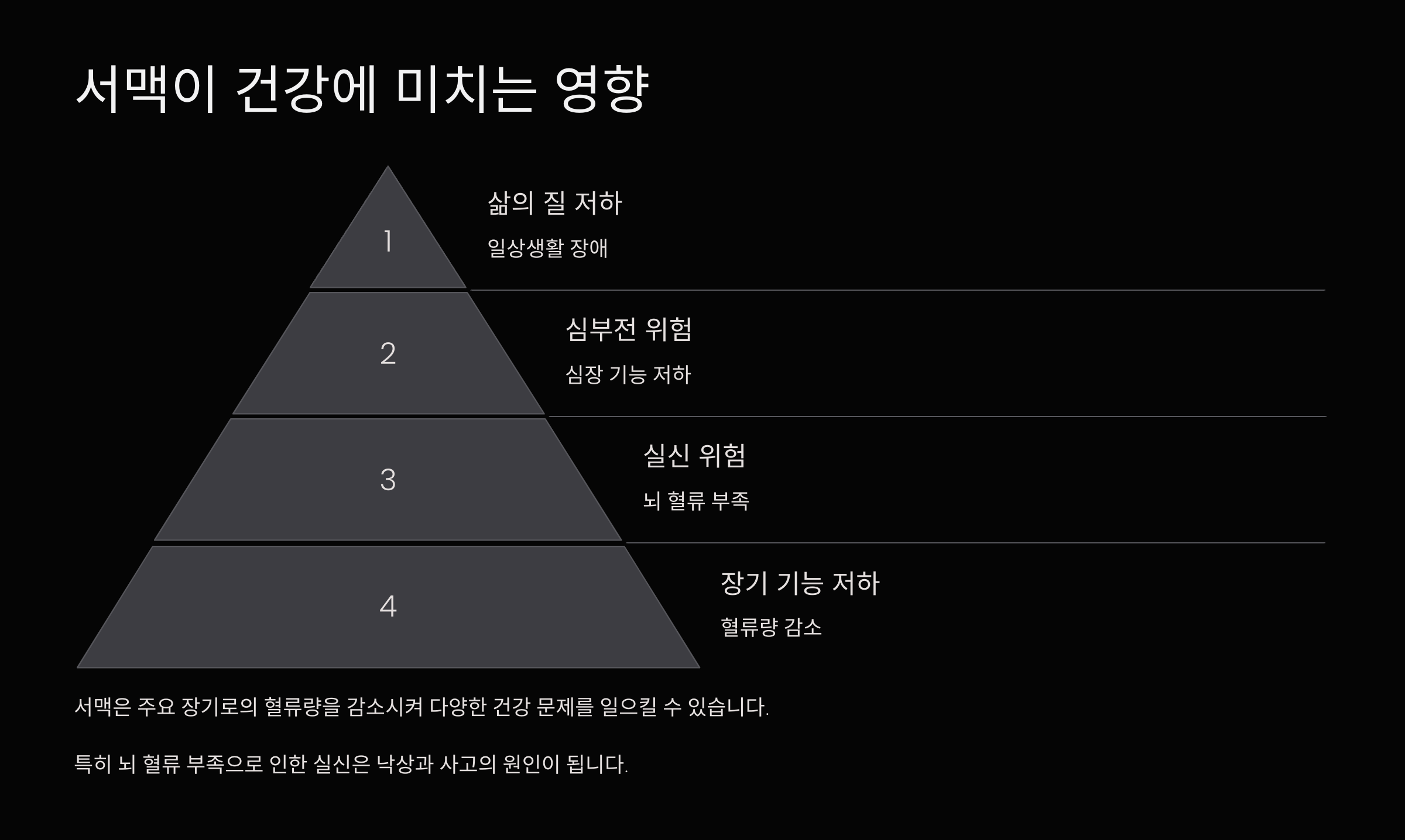 혈류가 원활하지 않으면 순간적으로 어지러움을 느끼며 실신할 수 있어요. 이로 인해 낙상 사고가 발생할 위험이 높아지죠.