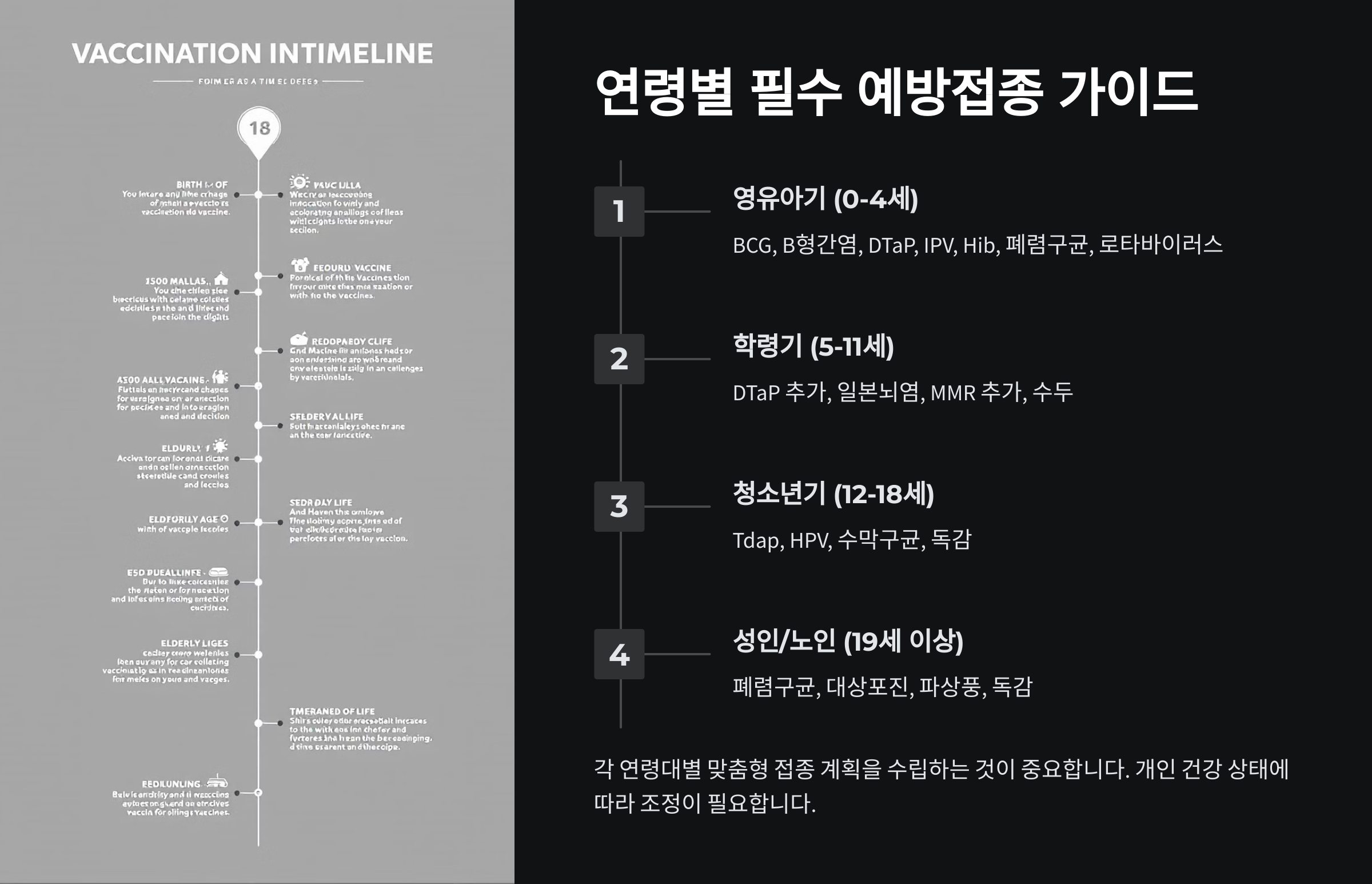 예방접종은 연령에 따라 종류와 접종 시기가 달라요. 특히 영유아, 소아, 청소년, 성인, 노인별로 필수 예방접종이 정해져 있답니다.