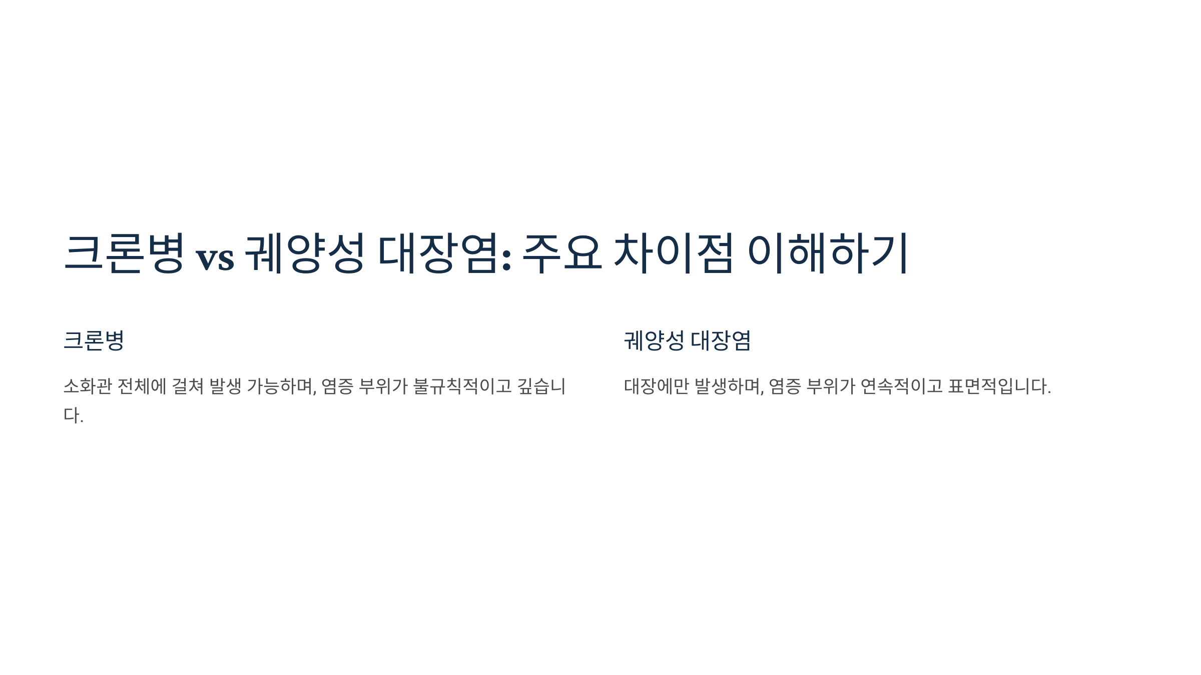 이처럼 크론병과 궤양성 대장염은 비슷해 보이지만 병변의 위치와 염증 형태에서 차이가 있어요. 따라서 정확한 진단이 중요하며, 각각의 치료법도 다르기 때문에 전문의 상담을 받는 것이 필요해요.