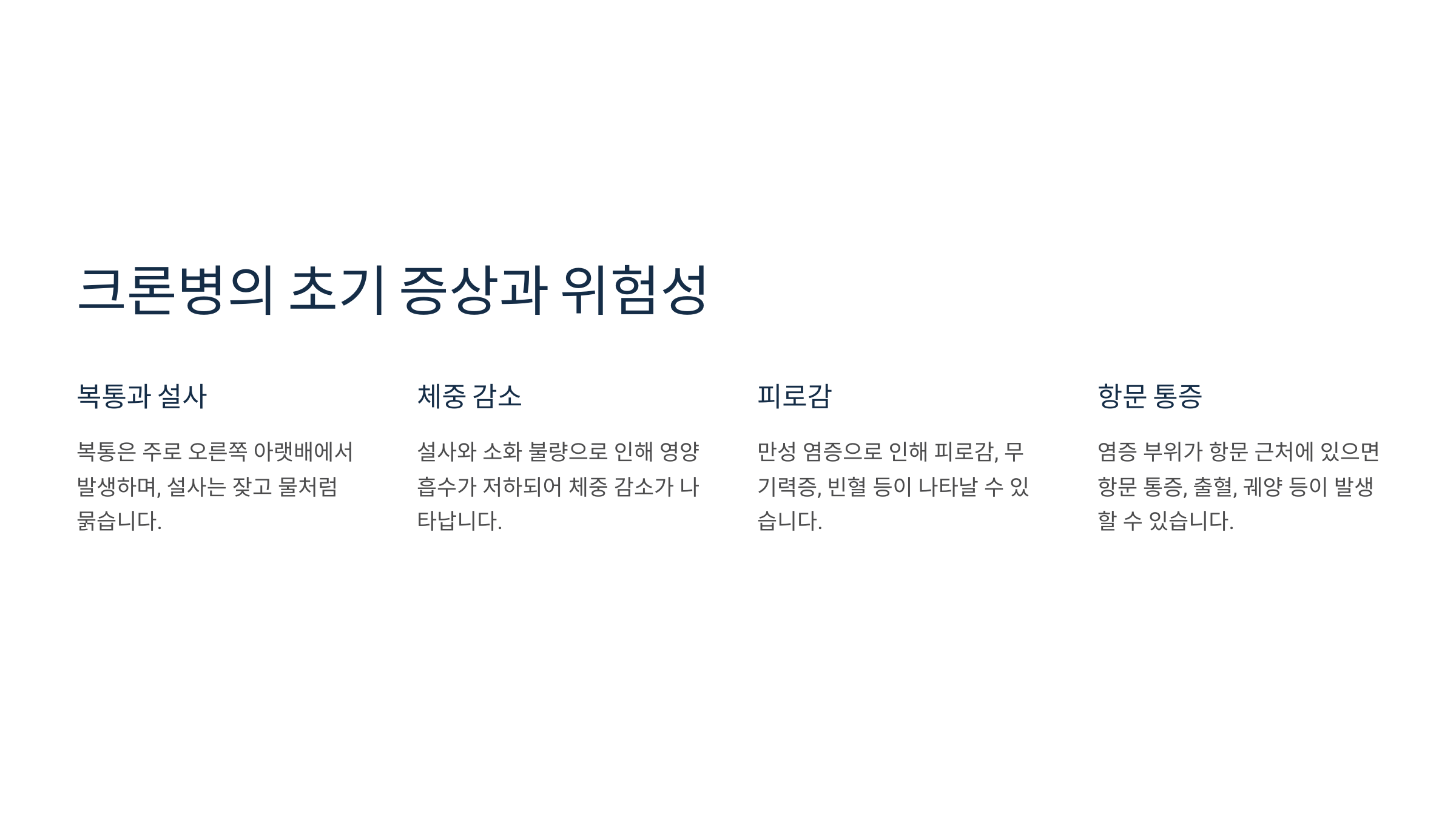 크론병은 초기에 적극적으로 관리하면 증상을 완화하고 삶의 질을 높일 수 있어요. 하지만 치료를 늦추면 장 손상이 심해질 가능성이 크기 때문에 증상이 지속된다면 병원을 찾아 정확한 진단을 받는 것이 좋아요.