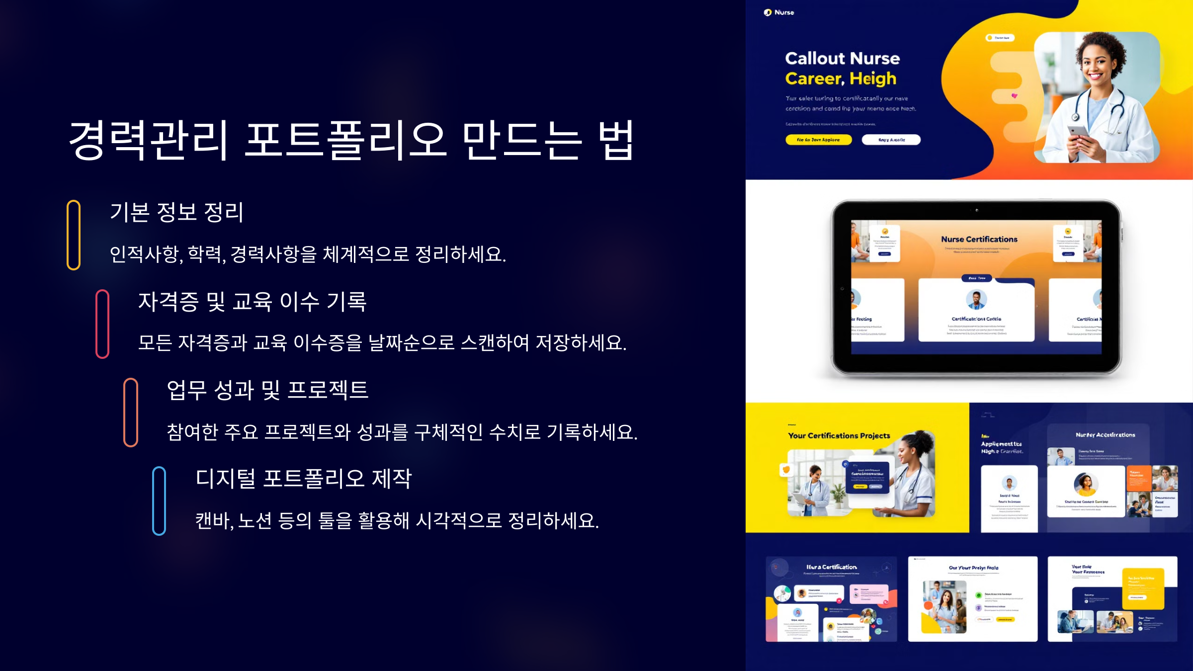 요즘 간호사들 사이에서 이직 준비할 때 ‘간호 포트폴리오’를 만드는 게 트렌드예요. 단순한 이력서보다 훨씬 전문적이고, 면접관에게 강한 인상을 줄 수 있는 도구로 활용되고 있어요. 특히 중간관리자나 스페셜티 부서 이직할 때는 거의 필수랍니다.