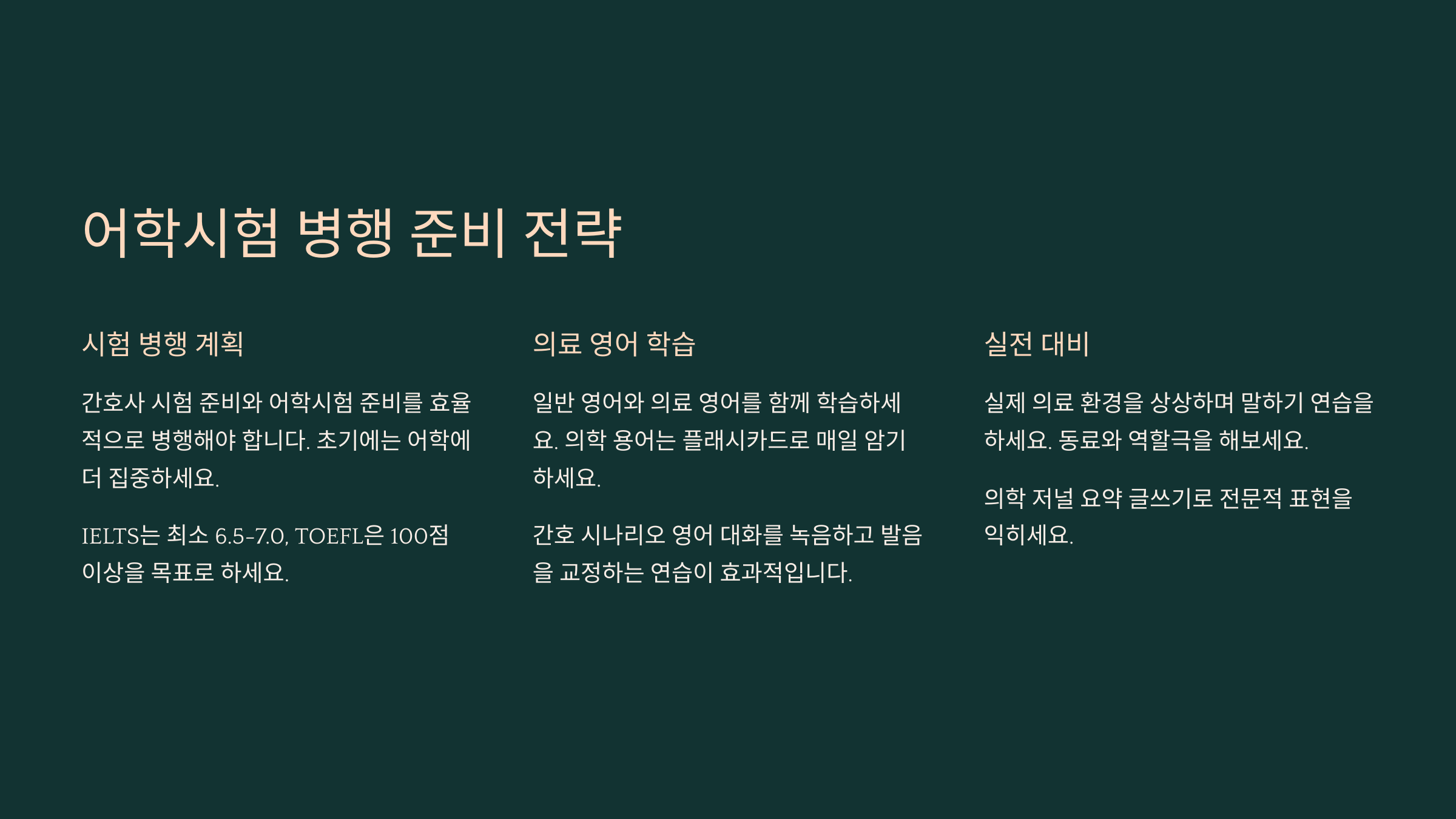 어학은 단기간 벼락치기로 오르지 않아요. 그래서 최대한 초반부터 같이 준비하고, 실생활 영어 노출을 늘려야 해요. 예를 들어, 'Nursing Documentary', 'Medical Podcast'를 출퇴근 길에 듣는 것도 굉장히 큰 도움이 된답니다 🎧✨