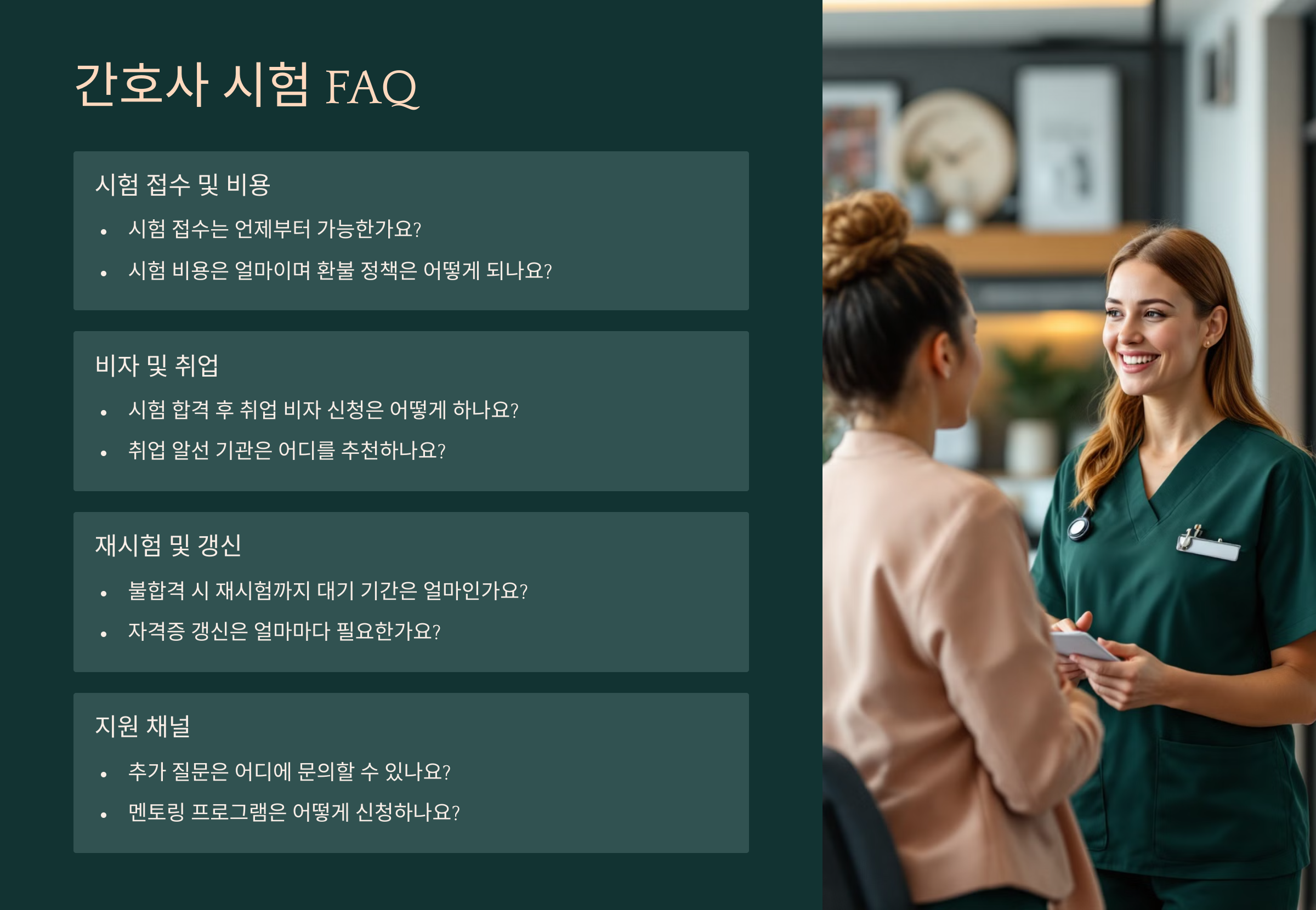 A1. 미국 간호협회에서 인정하는 간호학 학위와 영어 성적, 자격 심사를 통과해야 응시 자격이 생겨요.
