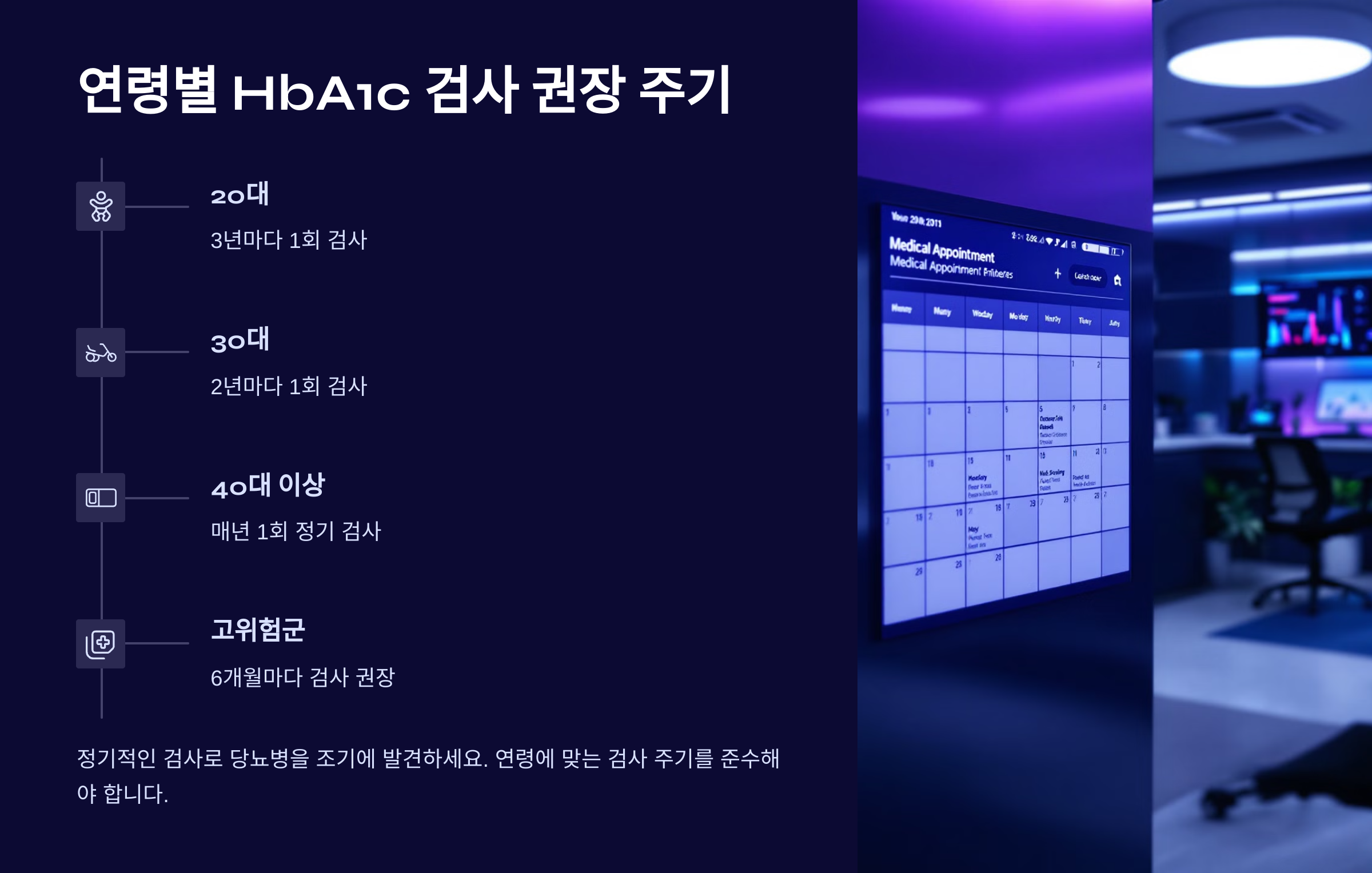 하지만 비만, 고혈압, 고지혈증, 가족력 같은 위험 요인을 가진 사람이라면 30대부터도 검사를 시작하는 것이 좋아요. 특히 복부 비만이 있거나 앉아 있는 시간이 긴 사무직 종사자들은 젊더라도 HbA1c 수치가 올라가기 쉽답니다.