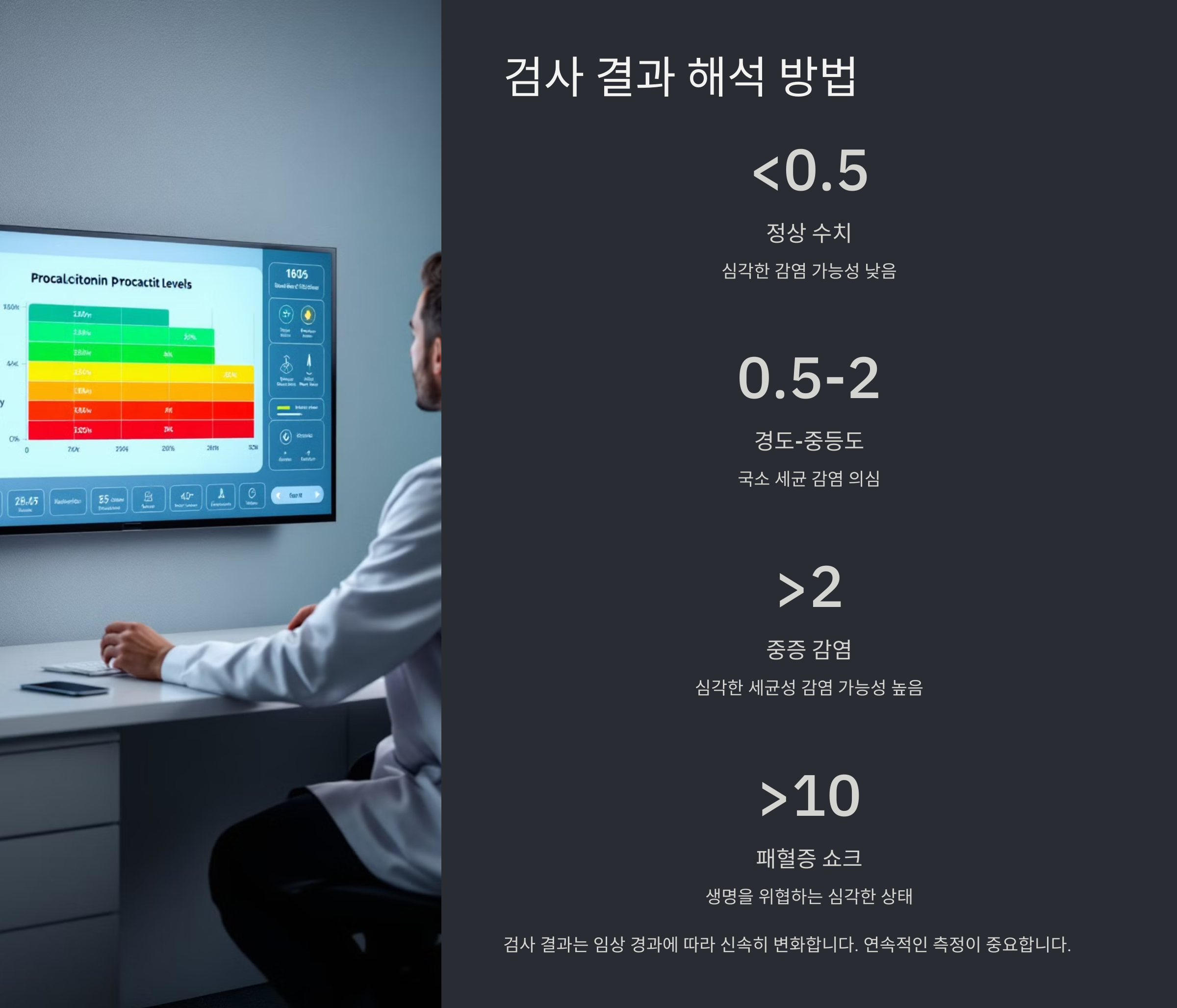 Procalcitonin 검사 결과는 수치만으로 판단하기보다는 환자의 증상과 병력, 다른 검사 결과와 함께 종합적으로 해석해야 해요. 예를 들어, 수치가 0.5ng/mL라고 해도 환자가 고열과 백혈구 증가증을 보인다면 감염 가능성이 크다고 판단해요.