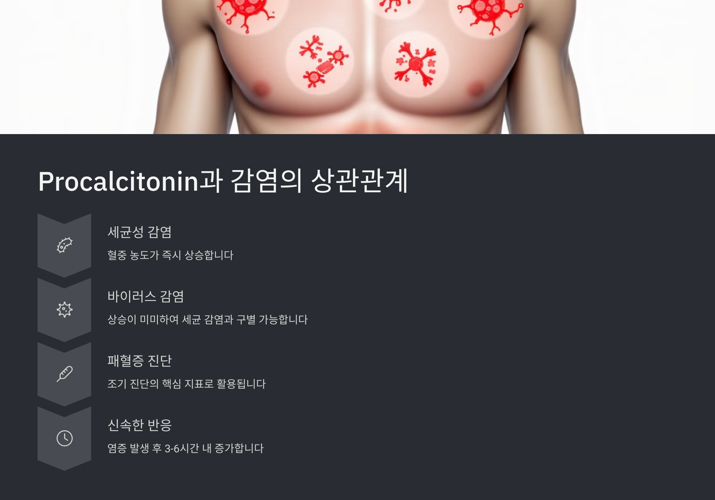 감염이 발생했을 때 몸의 여러 조직에서 Procalcitonin이 비정상적으로 분비되기 시작해요. 특히 세균 감염에서 특이적으로 반응하므로 바이러스성 감염과 구분하는 데 매우 유용하죠. 이 때문에 병원에서는 항생제를 사용할지 말지 결정할 때 참고 자료로 활용해요.