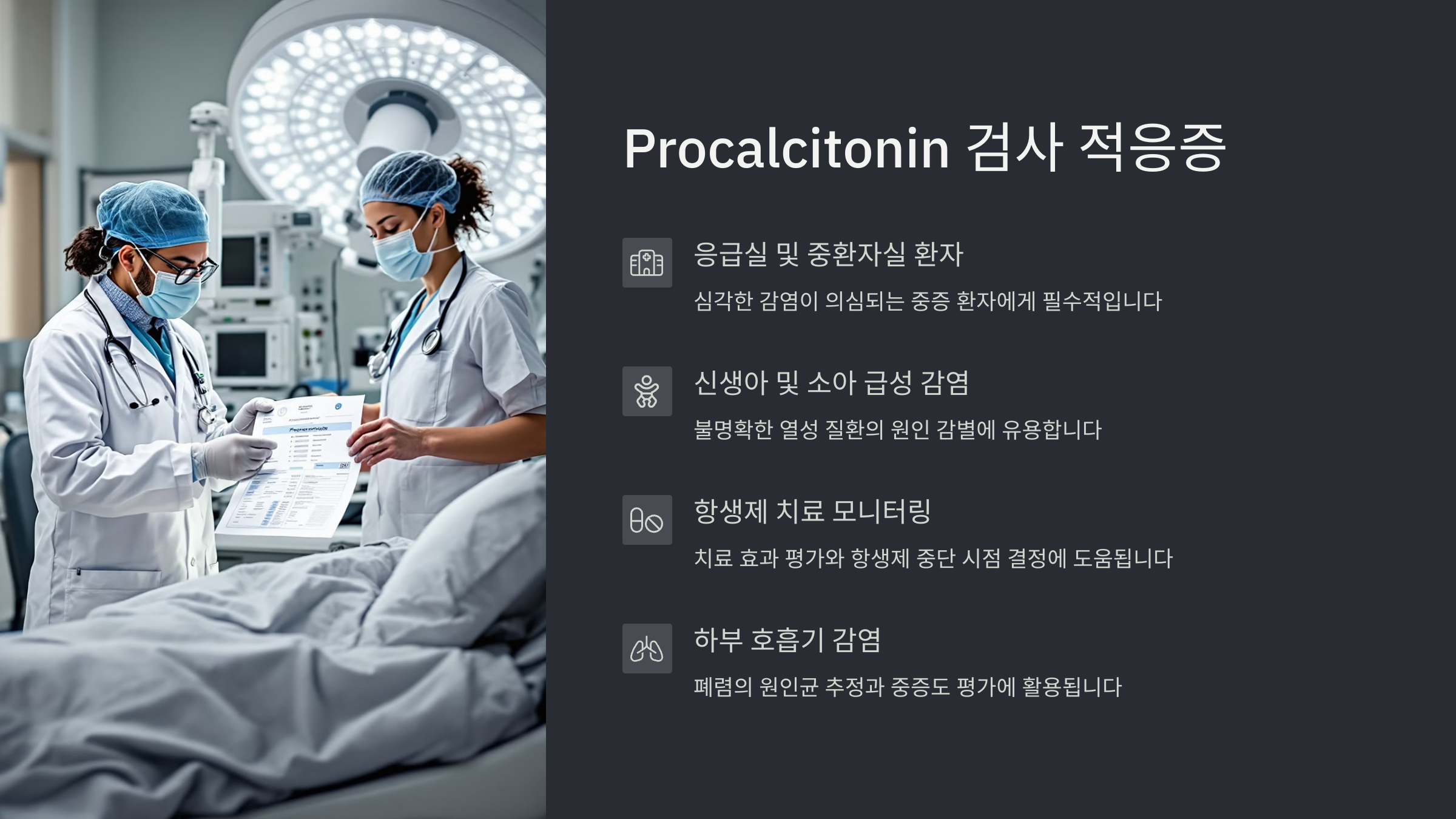 중환자실(ICU)에 있는 환자들 중 원인이 불명확한 발열이나 염증 반응이 있을 경우, Procalcitonin 검사를 통해 감염 여부를 조기에 감별할 수 있어요. 또한 면역이 억제된 환자(예: 항암 치료 중인 환자)에서는 미세한 감염도 조기에 포착하는 데 활용돼요.