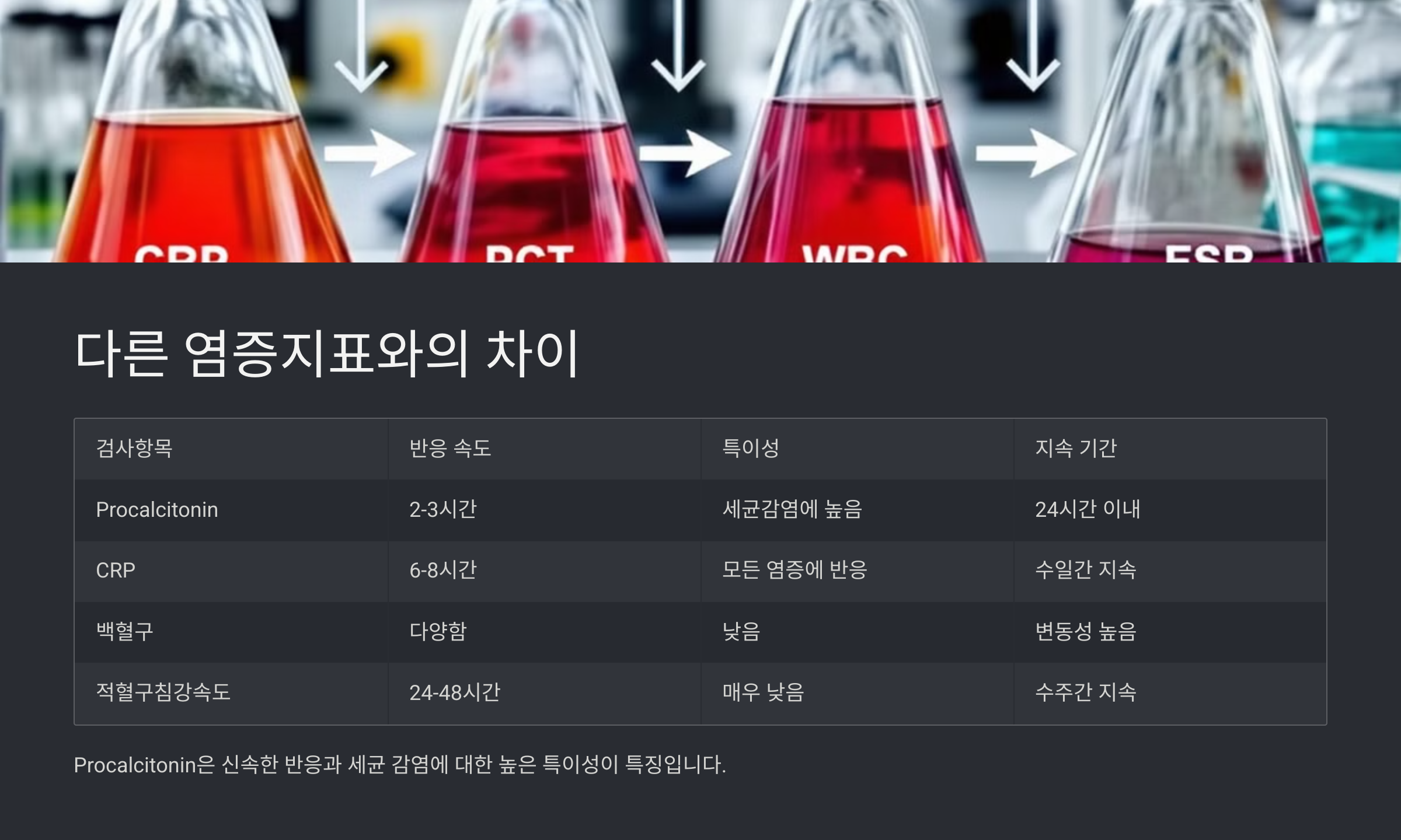 | Procalcitonin | 높음 (세균성) | 빠름 (6~12시간 내) | 감염 감별, 치료 반응 추적 |