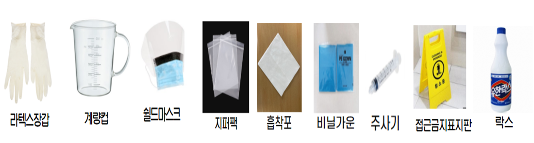 - 희석액이 다량 필요한 경우 : 1L 용기로 락스 10배 희석액(락스100ml+물1L)을 만들어 닦는다.