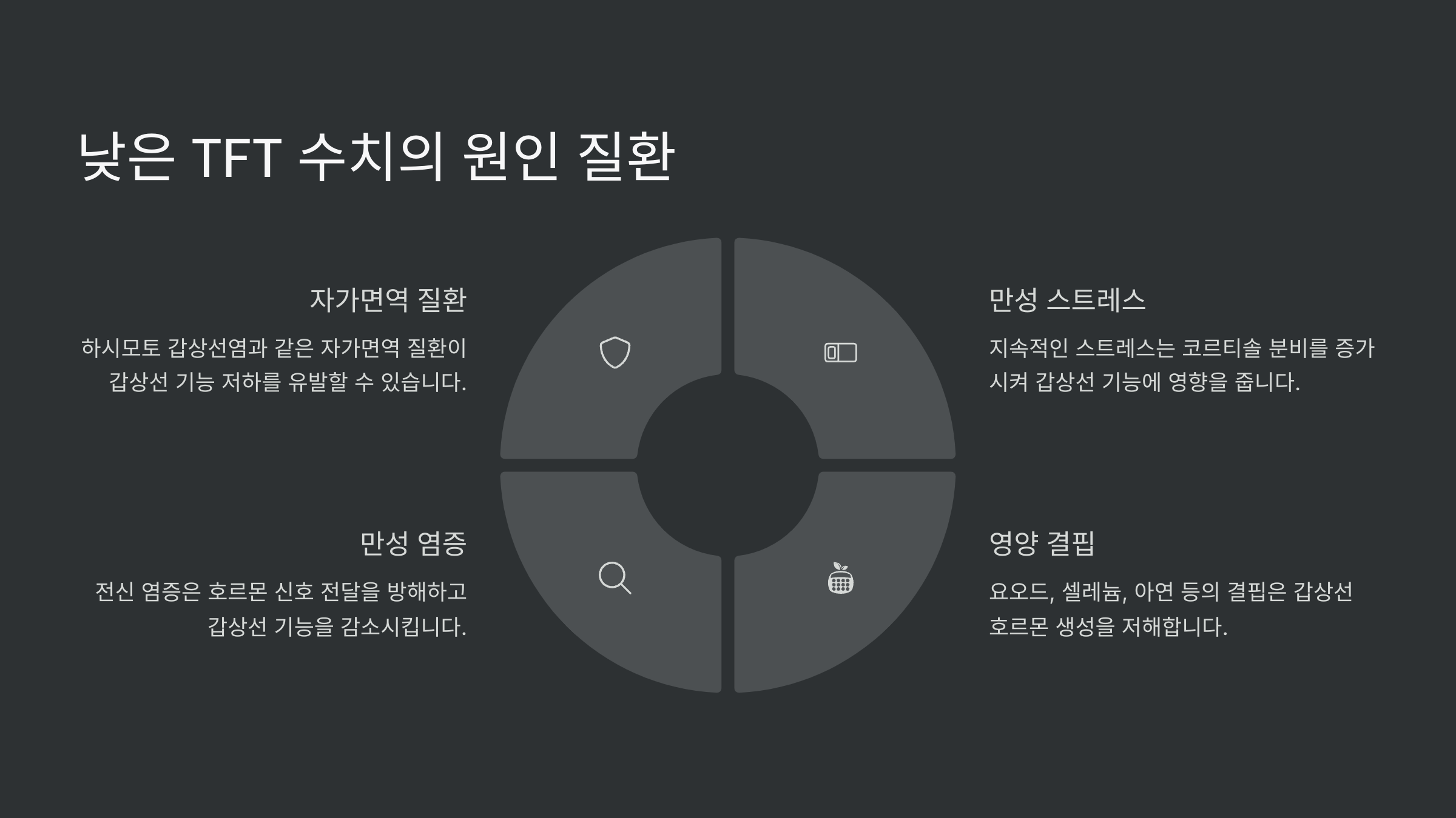 그 외에도 급격한 다이어트, 단식, 심한 스트레스나 감염, 만성질환 상태에서도 일시적으로 TFT 수치가 낮게 나올 수 있어요. 이런 상태를 ‘비갑상선성 질환 증후군’이라고 하는데, 검사를 해도 병으로 간주하지 않고 경과를 지켜보는 경우가 많아요.