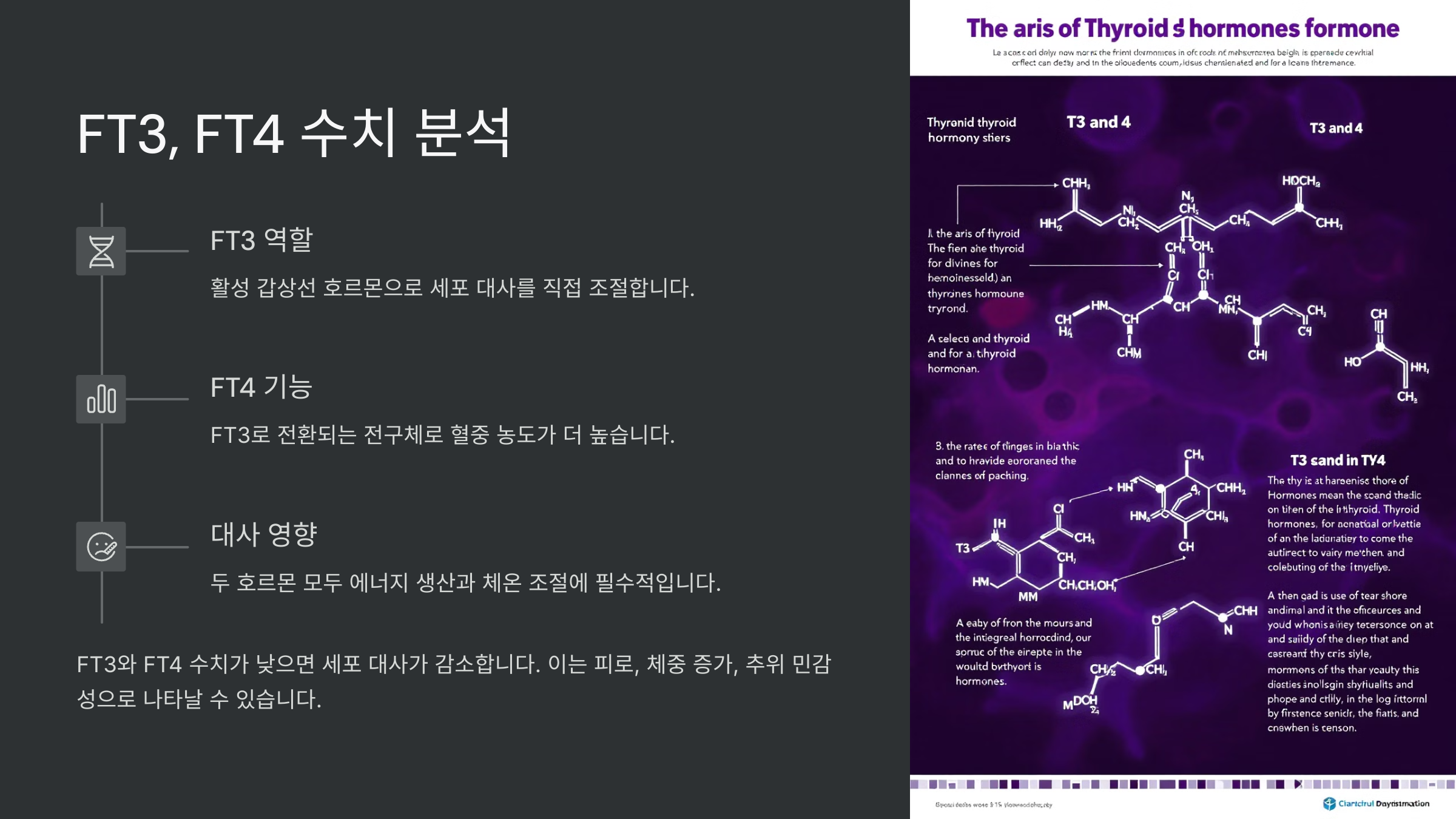 또한 급성 질병 상태나 스트레스, 영양 결핍 상태에서도 일시적으로 FT3가 떨어질 수 있어요. 이를 '비갑상선성 질환 증후군(Euthyroid Sick Syndrome)'이라고 부르는데, 이 경우 갑상선 자체는 정상인데도 호르몬이 적게 나오는 것처럼 보일 수 있어요.