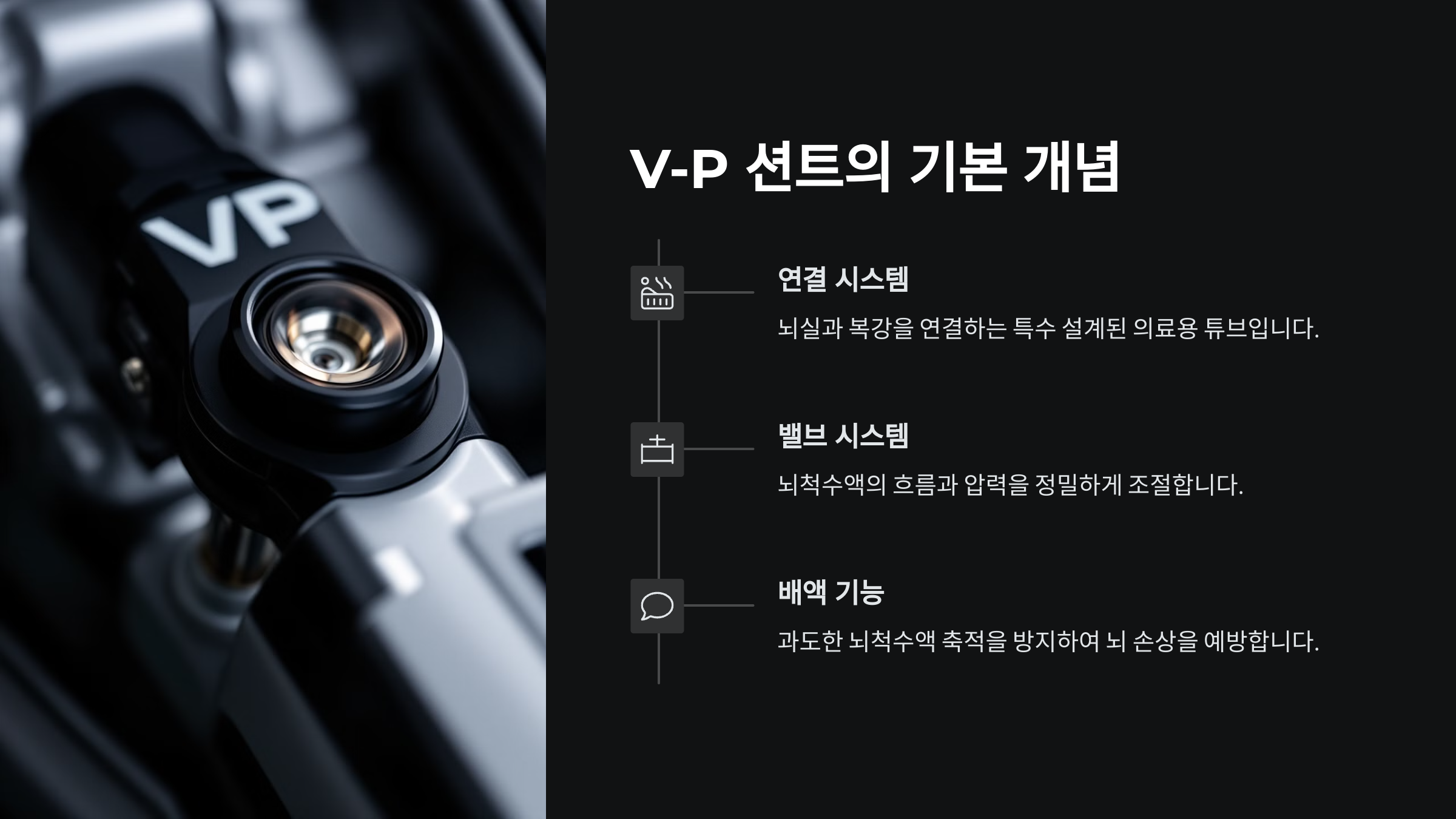 V-P 션트는 뇌에서 생성되는 뇌척수액(CSF)이 정상적으로 흡수되지 않거나 과다 생성되는 경우, 이를 복강으로 우회시켜 뇌압을 조절하는 의료 기구예요. 대표적인 사용 질환은 수두증(Hydrocephalus)이에요.
