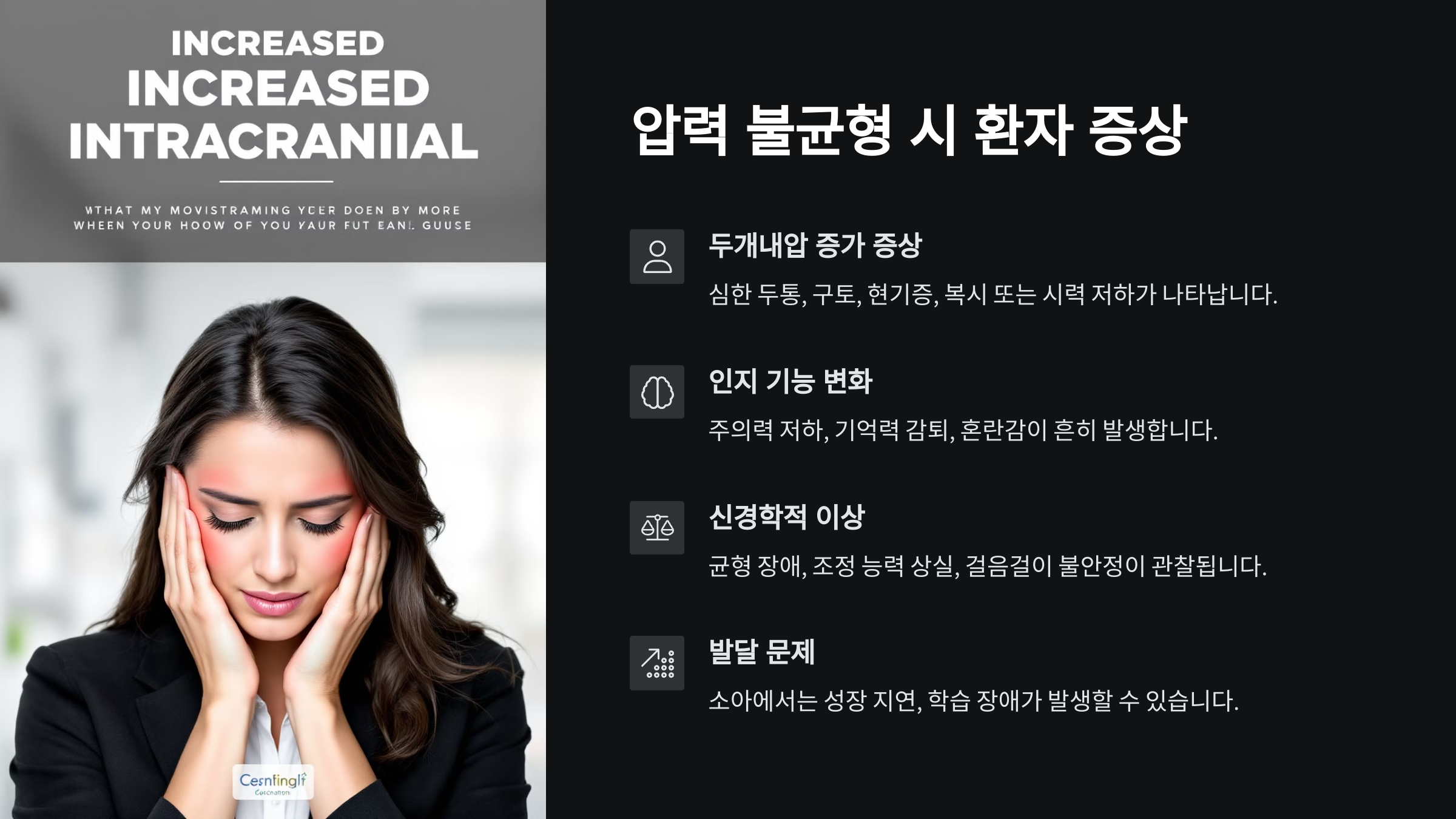 아이들의 경우, 구토나 두통보다는 짜증, 식욕 저하, 머리 둘레 증가로 나타나는 경우가 많아서 보호자의 세심한 관찰이 중요해요. 갓난아기라면 앞숫구멍(천문)이 팽창하는 것이 이상 신호일 수 있어요.