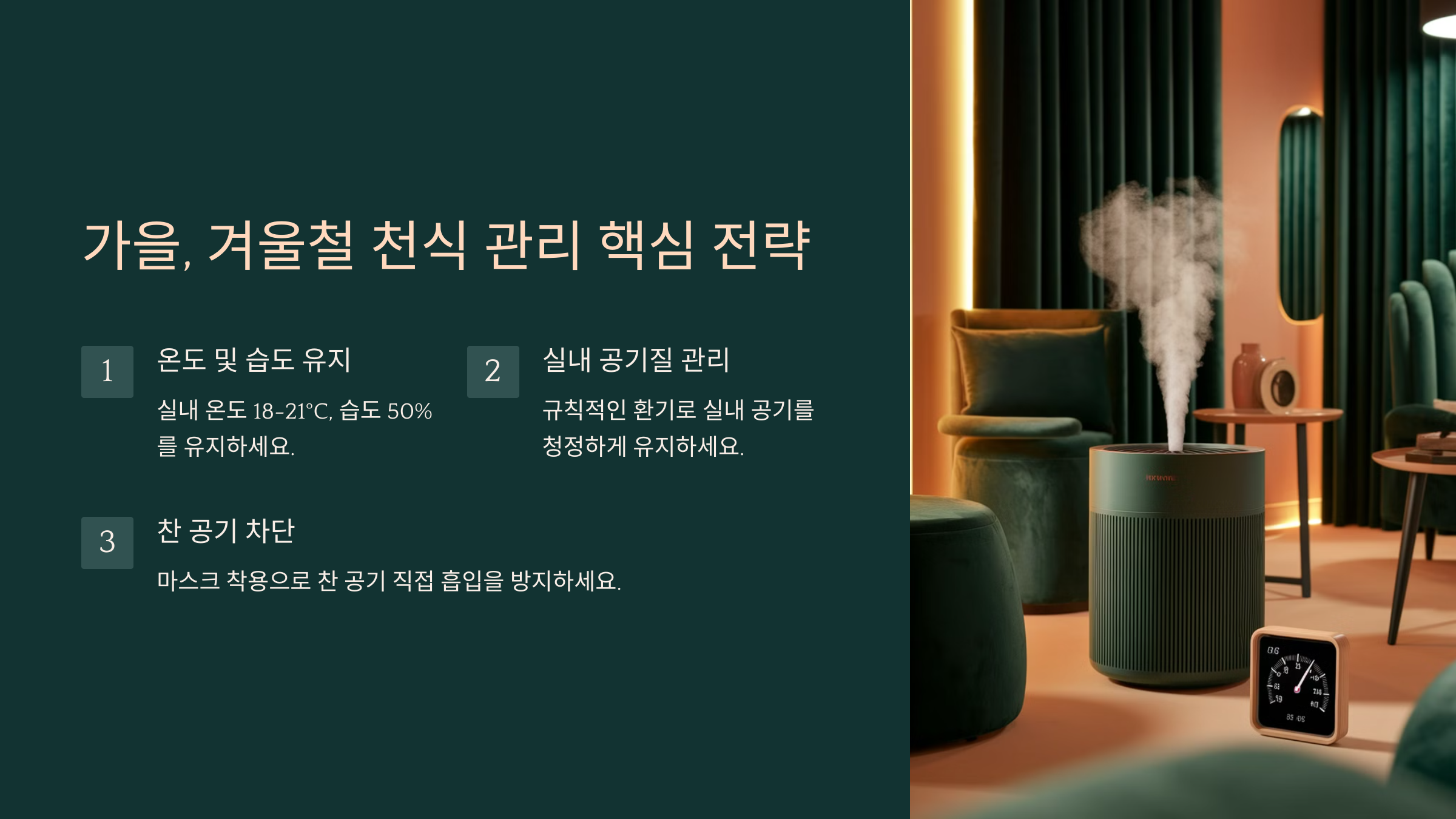 이처럼 계절별로 다양한 요인이 천식 증상을 악화시킬 수 있어요. 하지만 올바른 관리법을 실천하면 증상을 줄일 수 있답니다! 다음 섹션에서 가을과 겨울철 천식 관리법을 살펴볼게요. 🍁